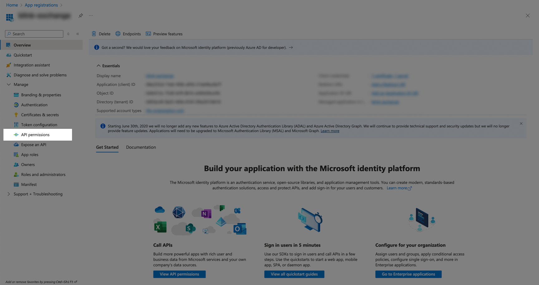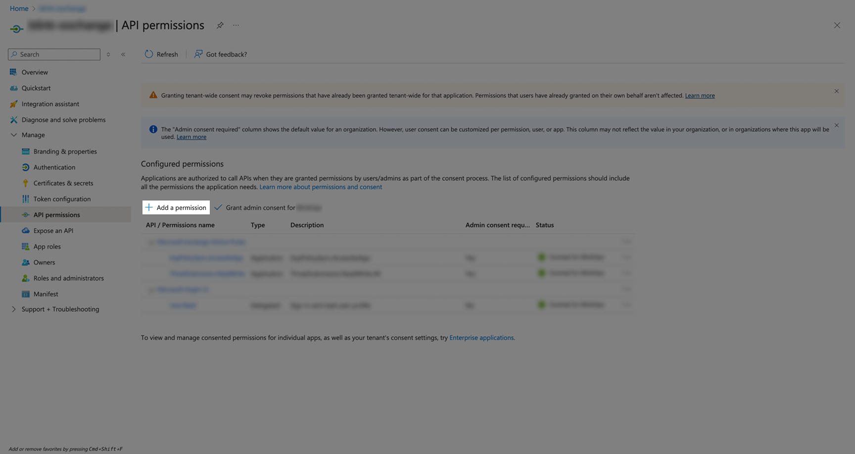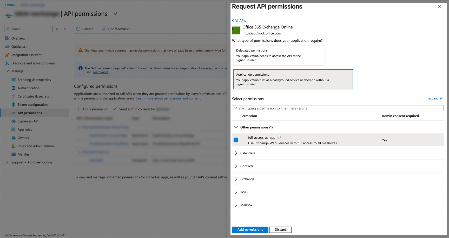 API Permissions name Type Exchange Exchange.ManageAsAppApplication permission Other permissions full_access_as_appApplication permission