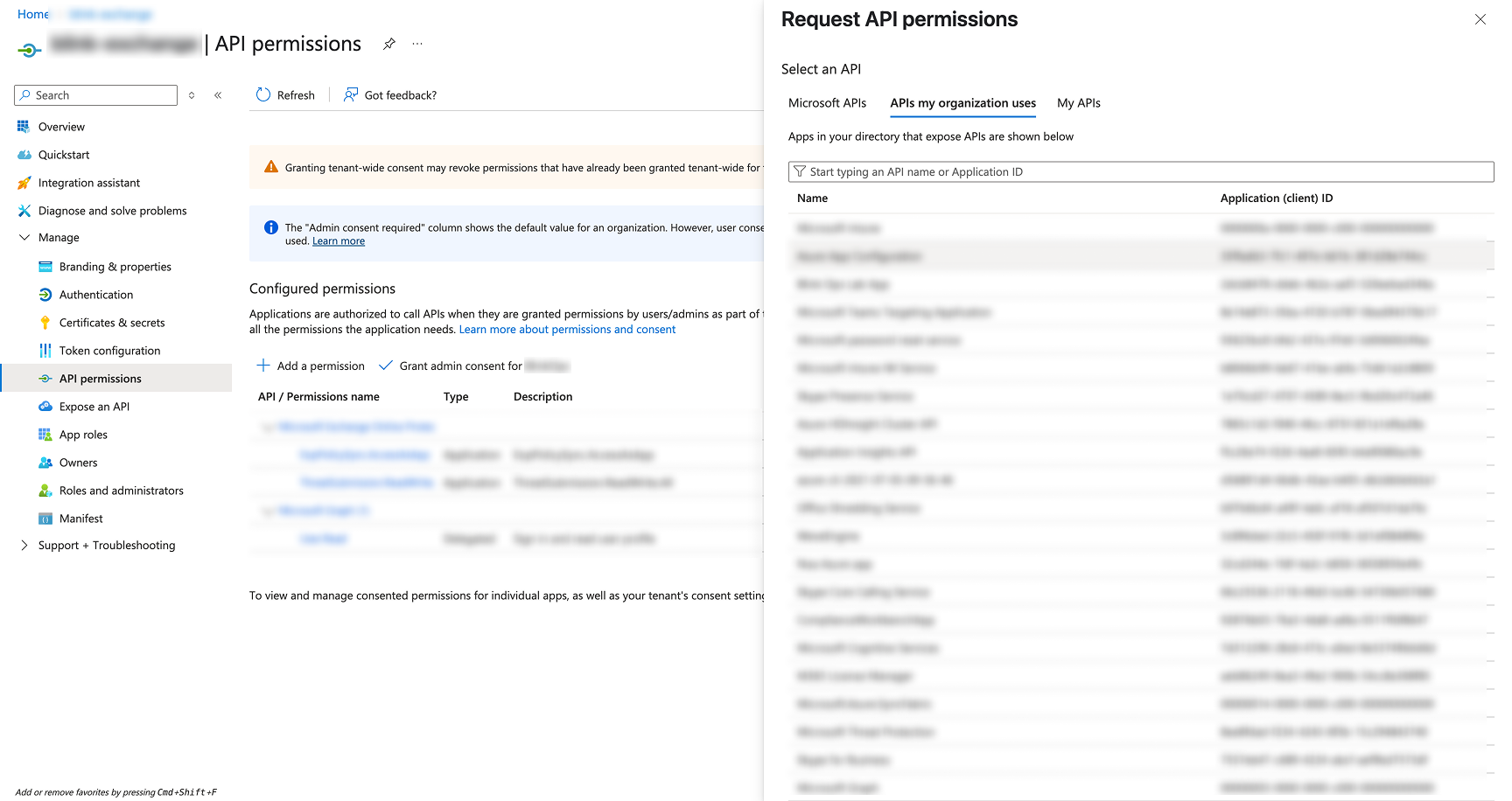 Select APIs my organization uses tab, then search for and select your Office 365 Exchange Online application.