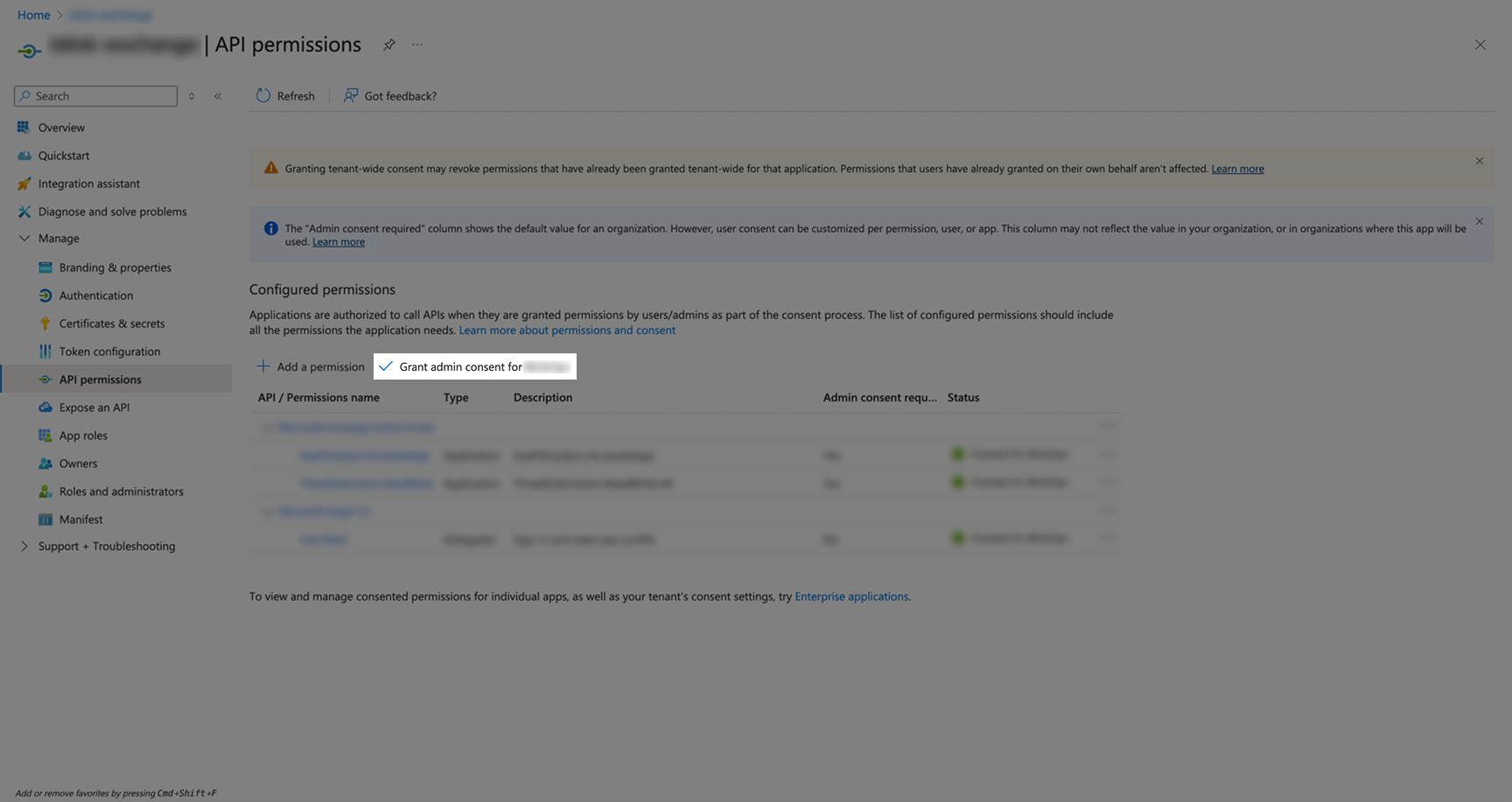 - After granting consent, the status should show green checkmarks indicating “Granted for [Your Organization]”.