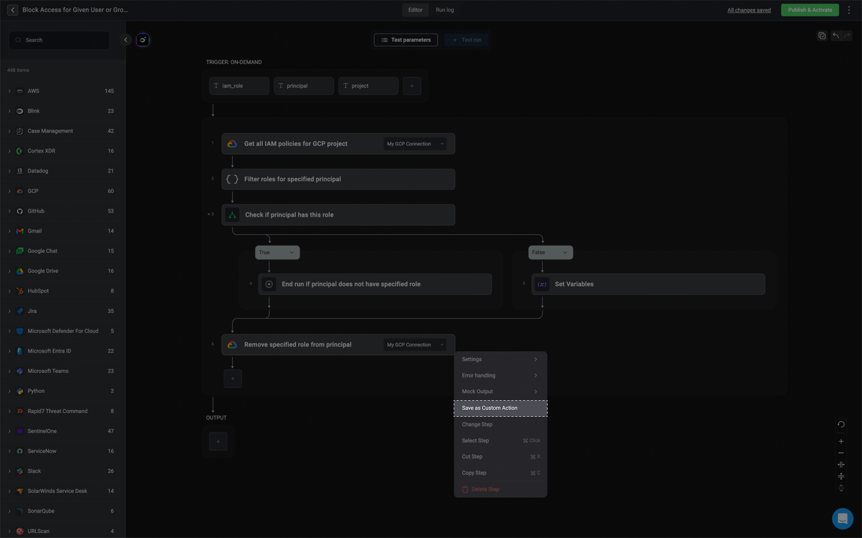 Custom Actions are reusable, user-defined actions that you can create from any existing action or subflow in a workflow. They allow you to package commonly used logic into a single, configurable unit that behaves just like a built-in action. Once saved, a custom action can be easily reused across multiple workflows, helping teams standardize processes, reduce duplication, and accelerate automation development.1
