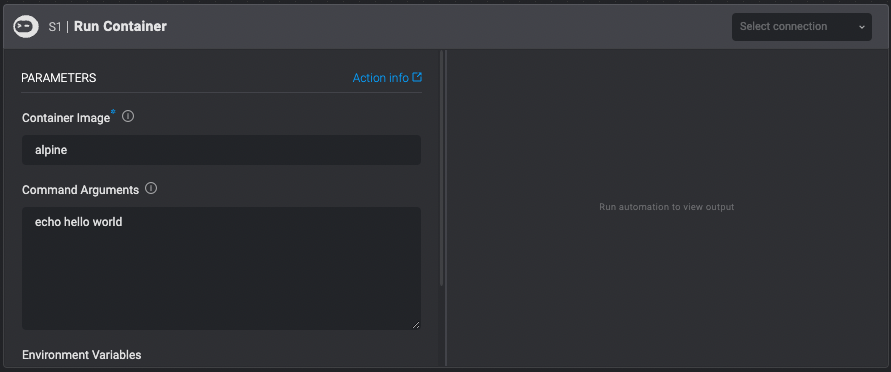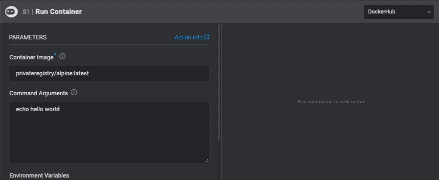 Running a container on Docker Runner deploys a container with the provided command and environment variables attached to it. The container stays alive until it finishes executing the command, or step timeout is reached. When running a container image stored on a private registry, provide the Registry Credentials, the runner will pull the image using credentials before running the container.Using images from private repositories