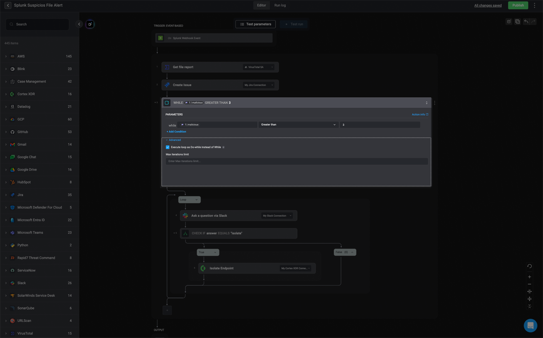 The while loop in the workflow is configured with the condition:If “malicious” is greater than 3, continue looping.- This means the workflow will repeatedly check if the number of malicious detections in the file report (from VirusTotal) exceeds 3. If this condition holds true, the loop will continue executing the steps inside it.