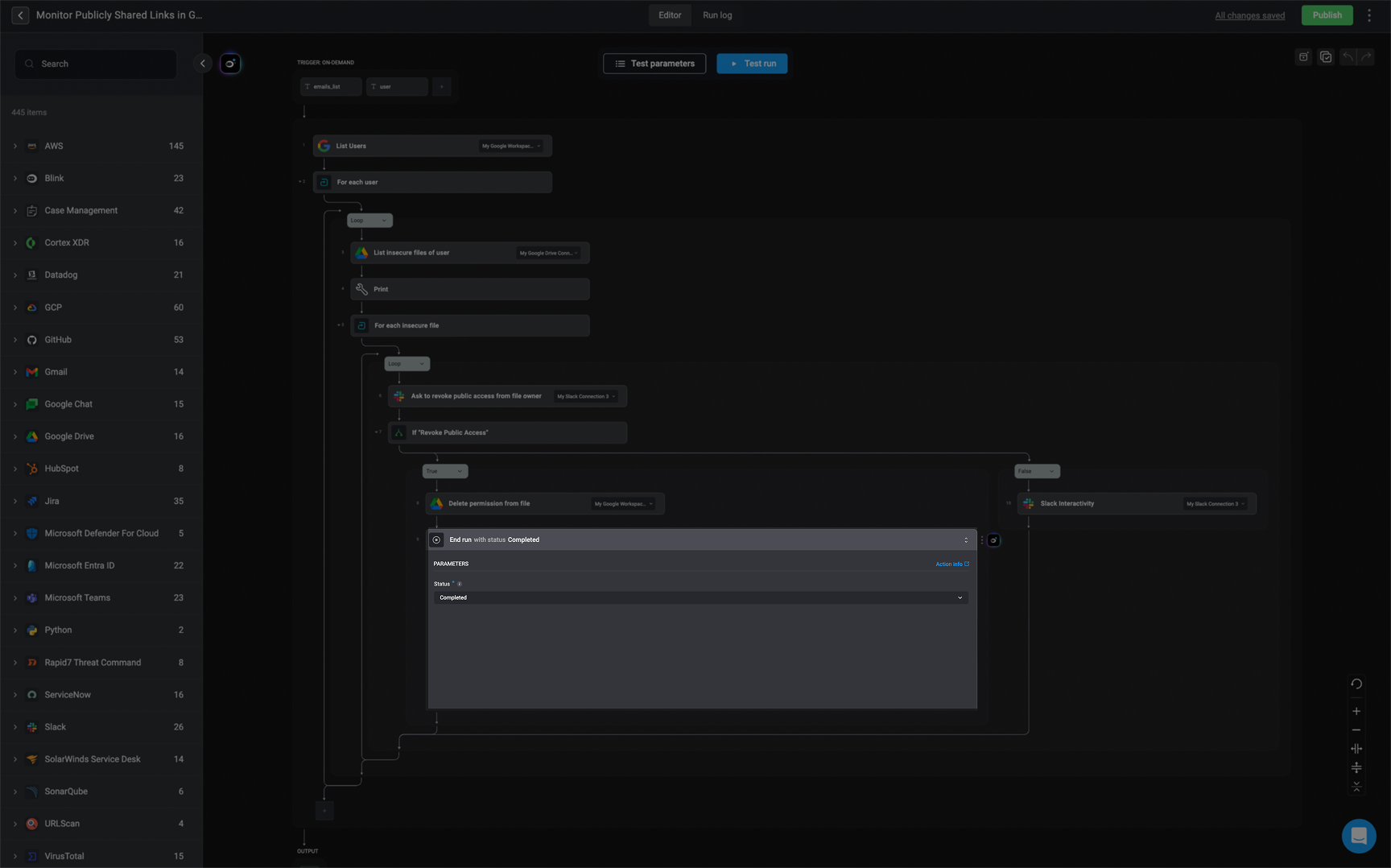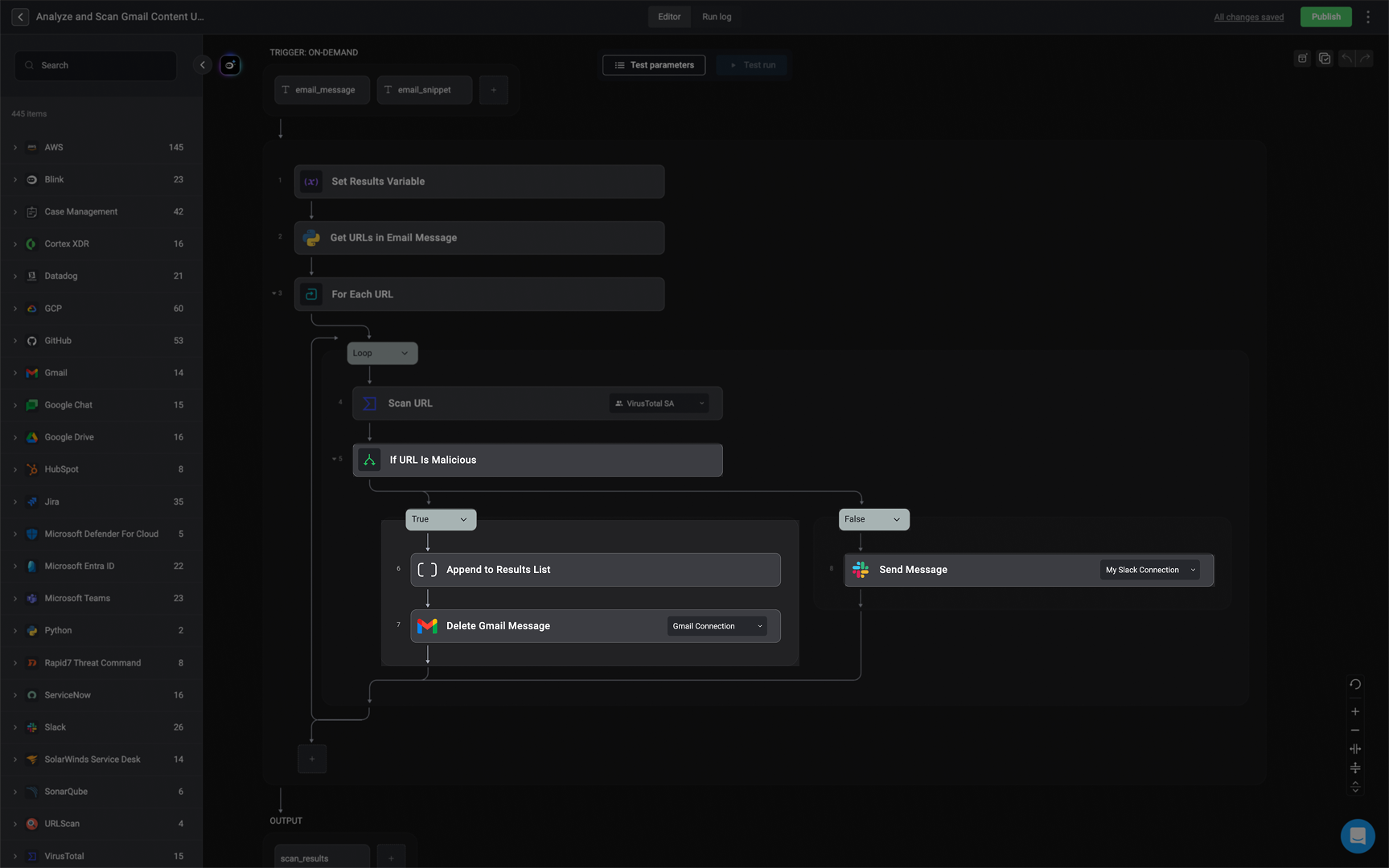 - If true, the workflow notifies a Slack channel and deletes the email to prevent potential threats.