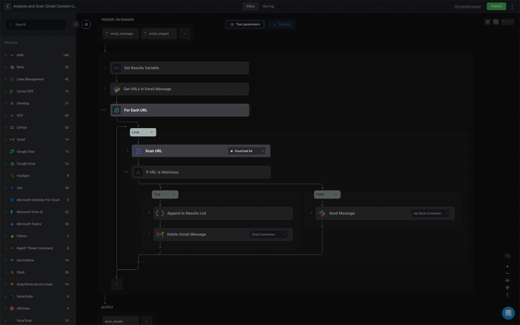 This workflow is designed to detect and respond to potentially malicious emails in Gmail. It starts when a new email arrives and extracts key details, including any URLs present in the email. The workflow then analyzes each URL to determine if it is malicious. If a malicious URL is found, the workflow takes automated response actions, such as notifying a channel and deleting the email.