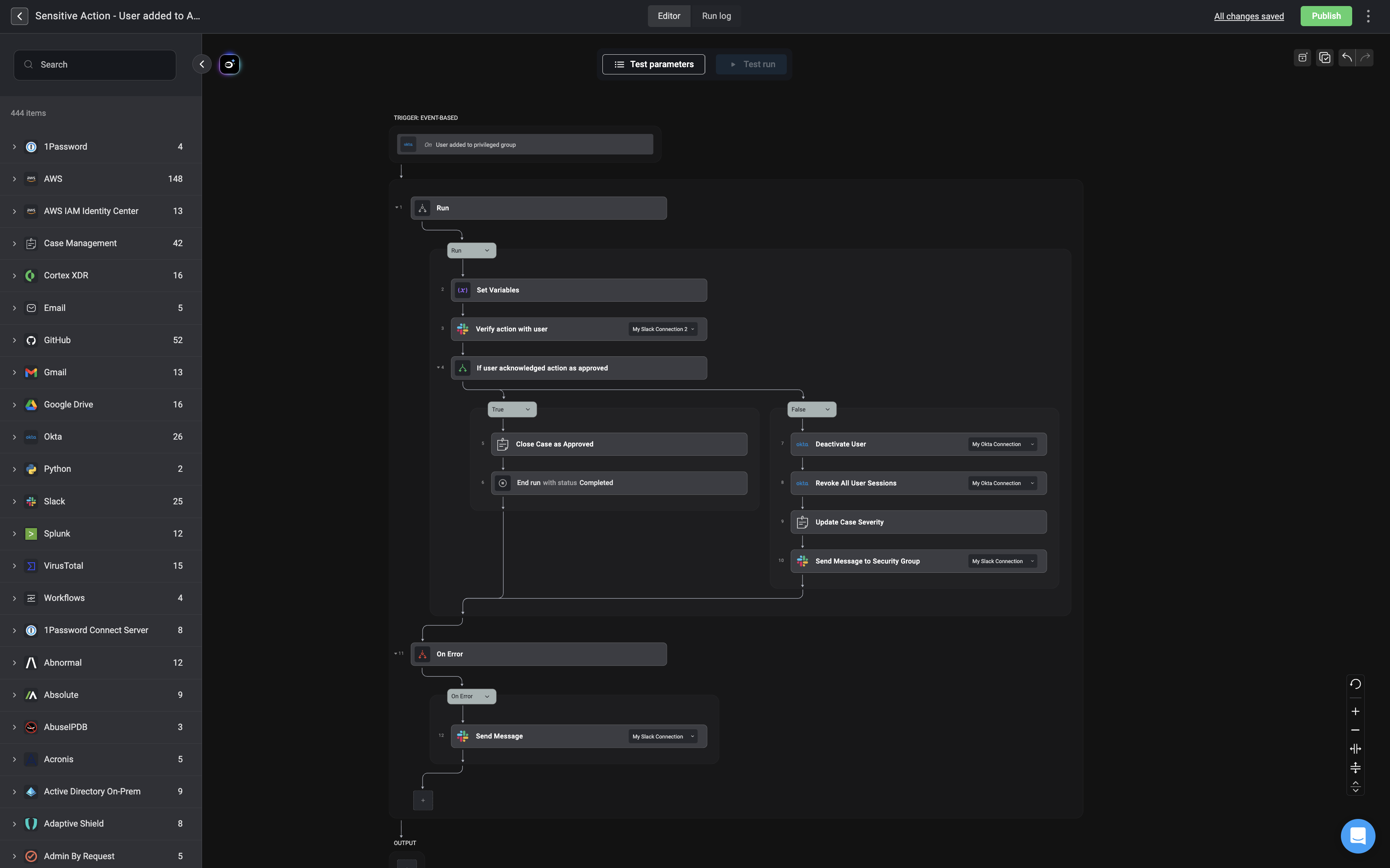 This workflow monitors when a user is added to a privileged group and verifies the action to ensure it’s authorized. Depending on the user’s response, the workflow either closes the case or initiates remediation steps.