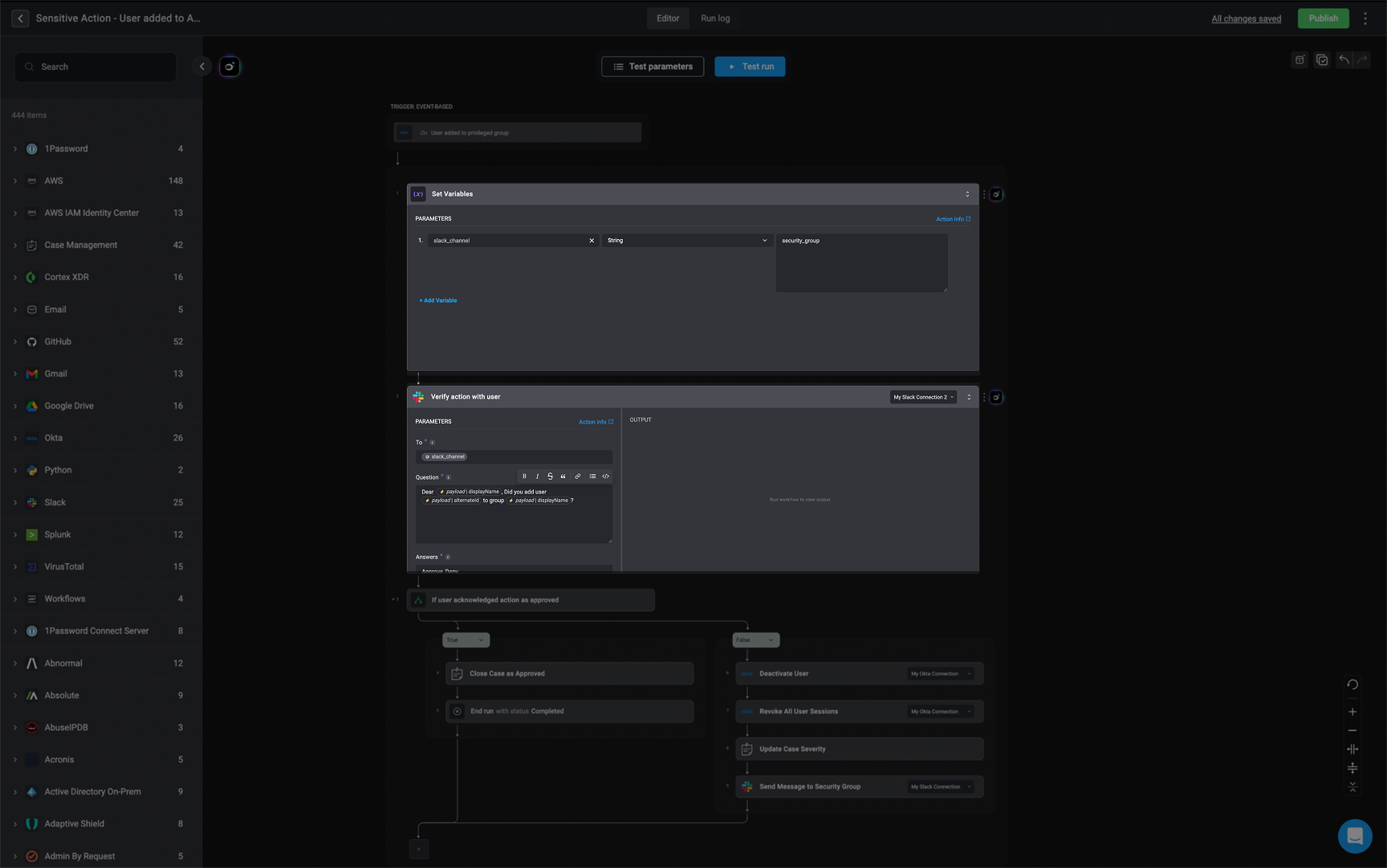 - Verify Action with User Sends a Slack message to the affected user, prompting them to confirm whether the action was expected and authorized.