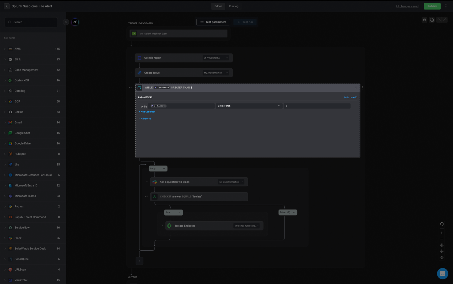 This Splunk Suspicious File Alert workflow automates threat response by analyzing potentially malicious files detected by Splunk, creating a Jira issue, and checking VirusTotal for threat intelligence. If a file has more than three malicious detections, it prompts a security analyst via Slack to decide whether to isolate the affected endpoint using Cortex XDR.