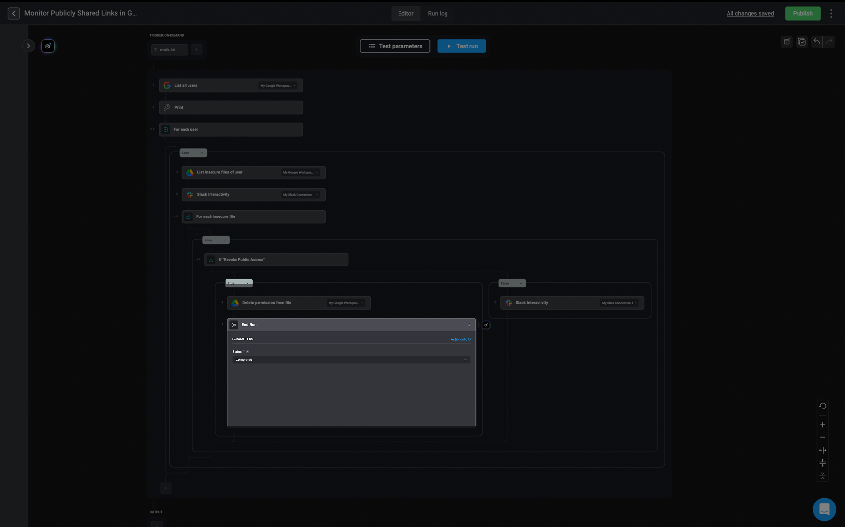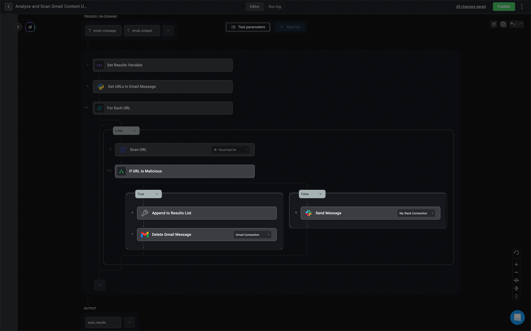 - If true, the workflow notifies a Slack channel and deletes the email to prevent potential threats.