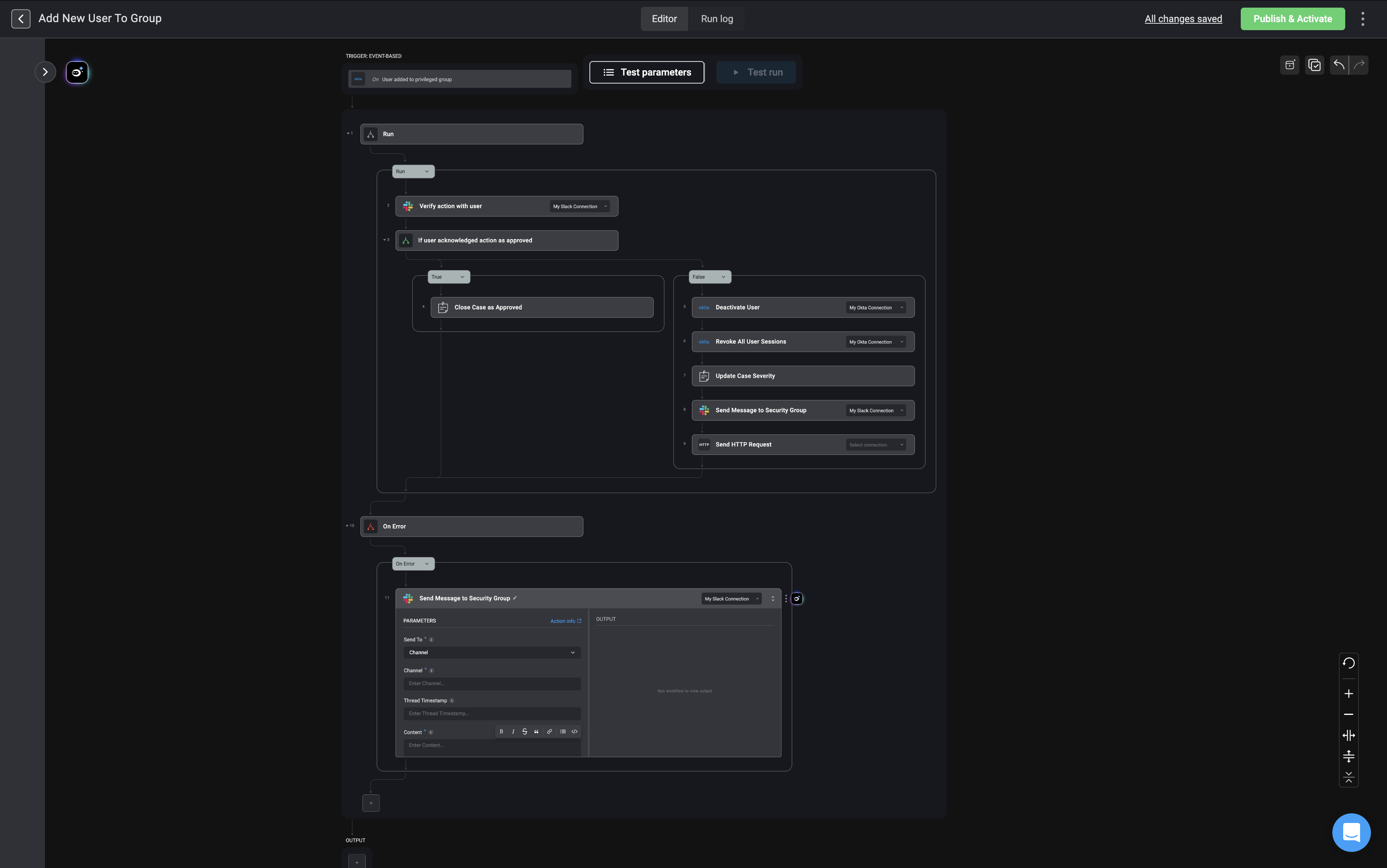 This workflow monitors when a user is added to a privileged group and verifies the action to ensure it’s authorized. Depending on the user’s response, the workflow either closes the case or initiates remediation steps.