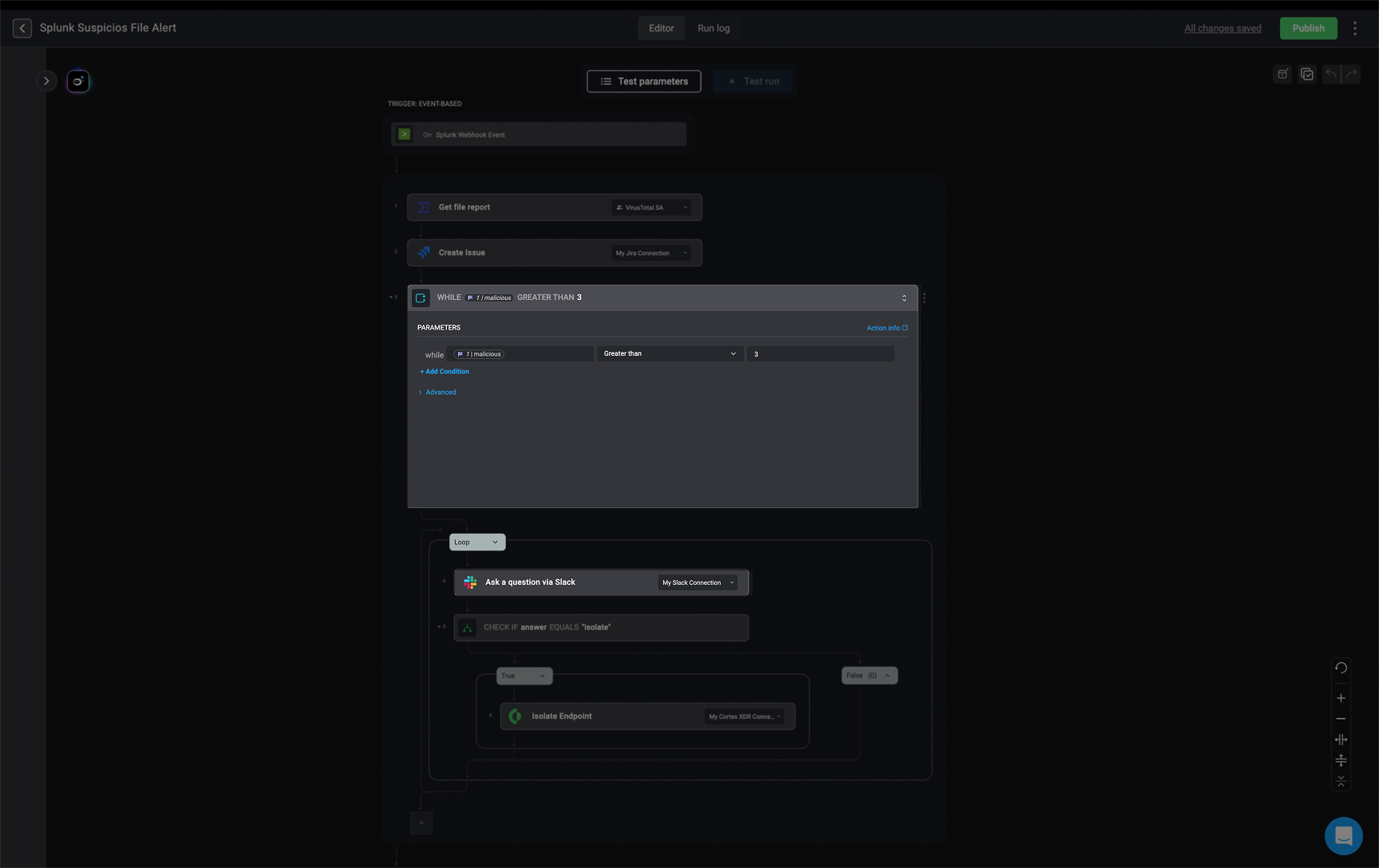 This Splunk Suspicious File Alert workflow automates threat response by analyzing potentially malicious files detected by Splunk, creating a Jira issue, and checking VirusTotal for threat intelligence. If a file has more than three malicious detections, it prompts a security analyst via Slack to decide whether to isolate the affected endpoint using Cortex XDR.