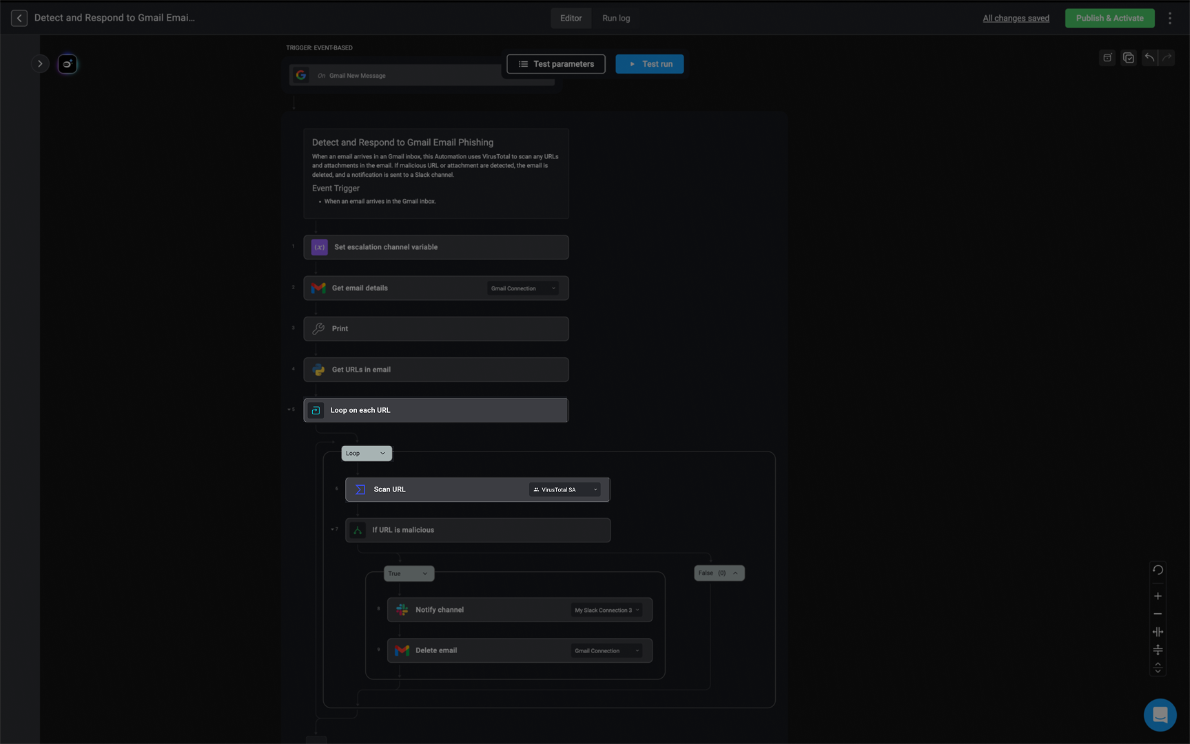 This workflow is designed to detect and respond to potentially malicious emails in Gmail. It starts when a new email arrives and extracts key details, including any URLs present in the email. The workflow then analyzes each URL to determine if it is malicious. If a malicious URL is found, the workflow takes automated response actions, such as notifying a channel and deleting the email.
