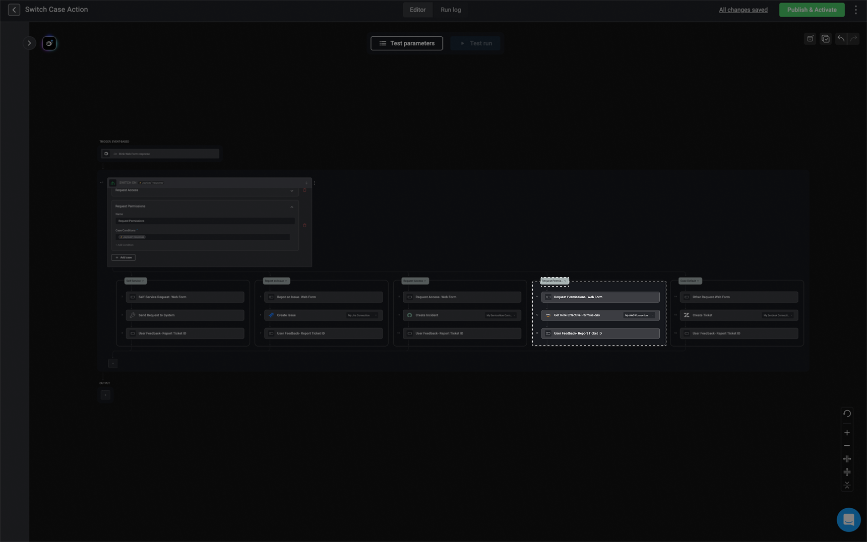 - If the submission is about requesting access, the workflow opens a ticket in ServiceNow with the request details, and captures user feedback.