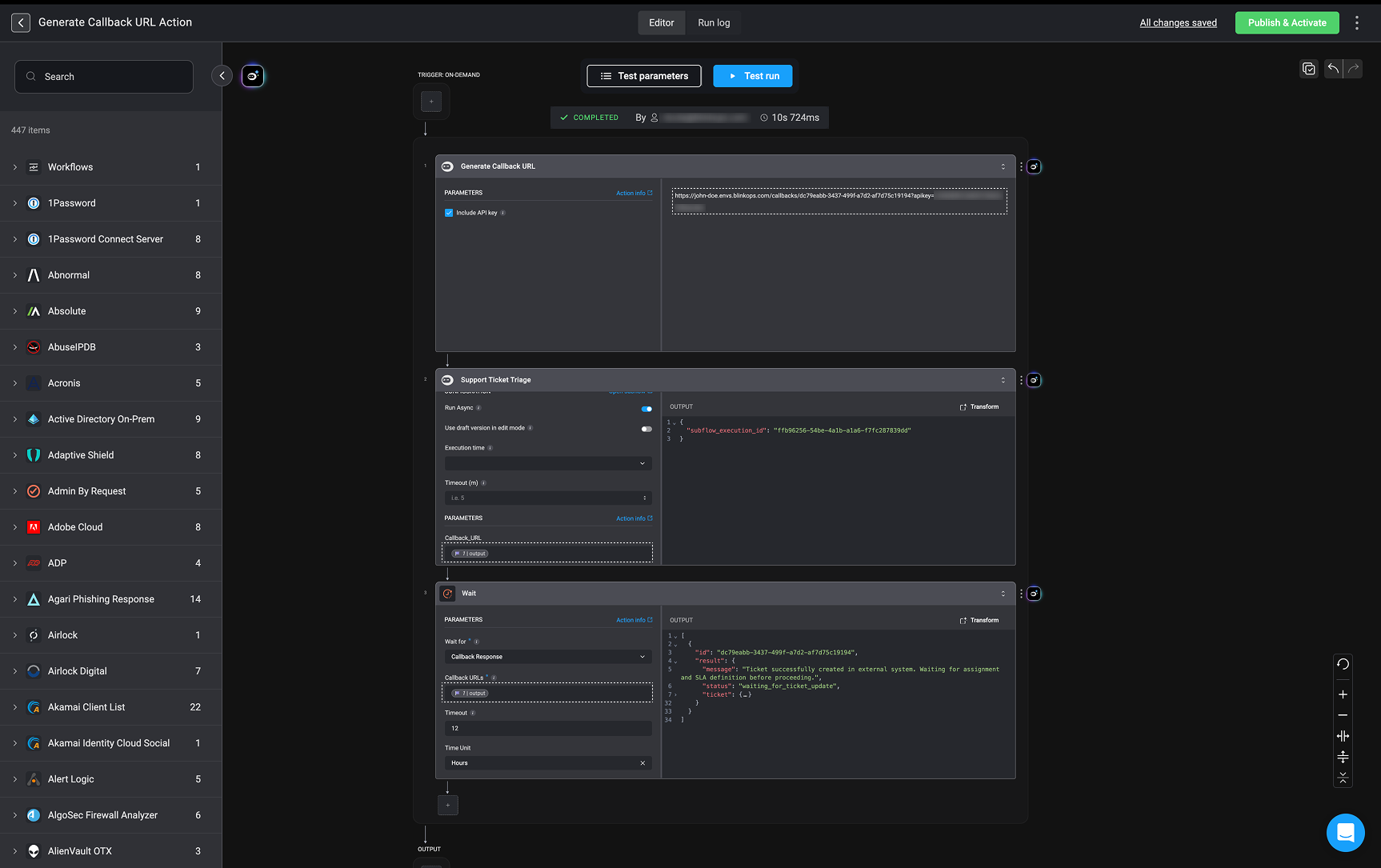 Callback URLs are especially useful in workflows that involve asynchronous interactions with third-party systems. For example, a customer uses blink to automate a support ticket triage:- When an end user submits a support request through the customer’s support portal, a blink workflow is triggered to create a corresponding ticket in the external ticketing system (with a callback URL).
