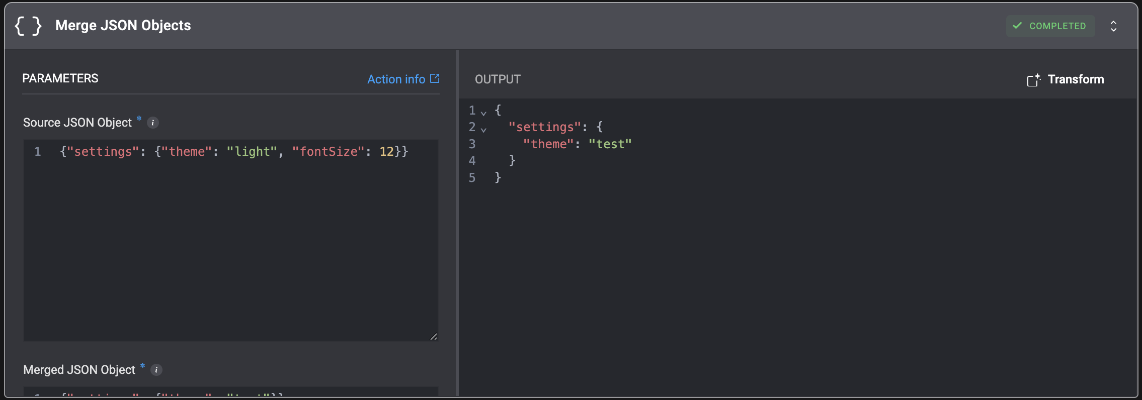| Merged JSON Object | The JSON object containing the new data to be merged into the source. |