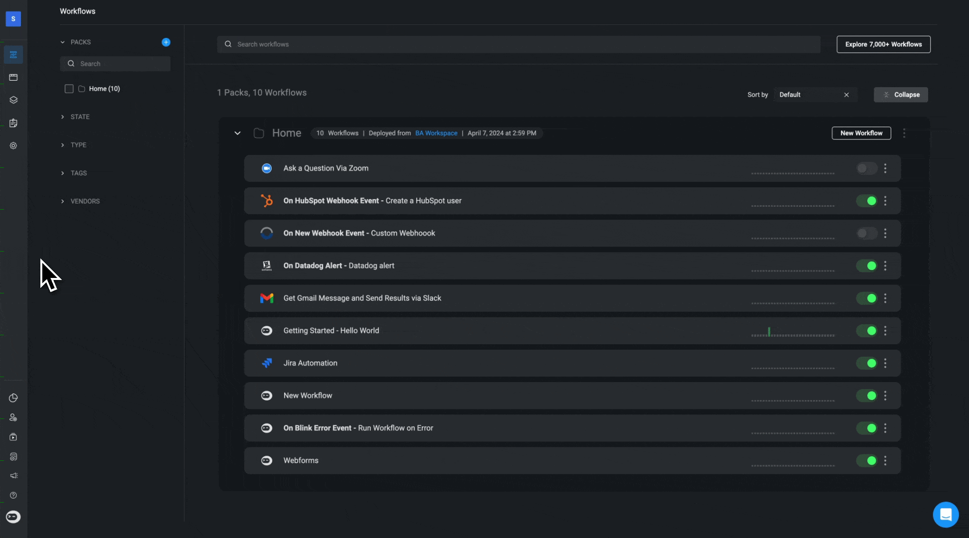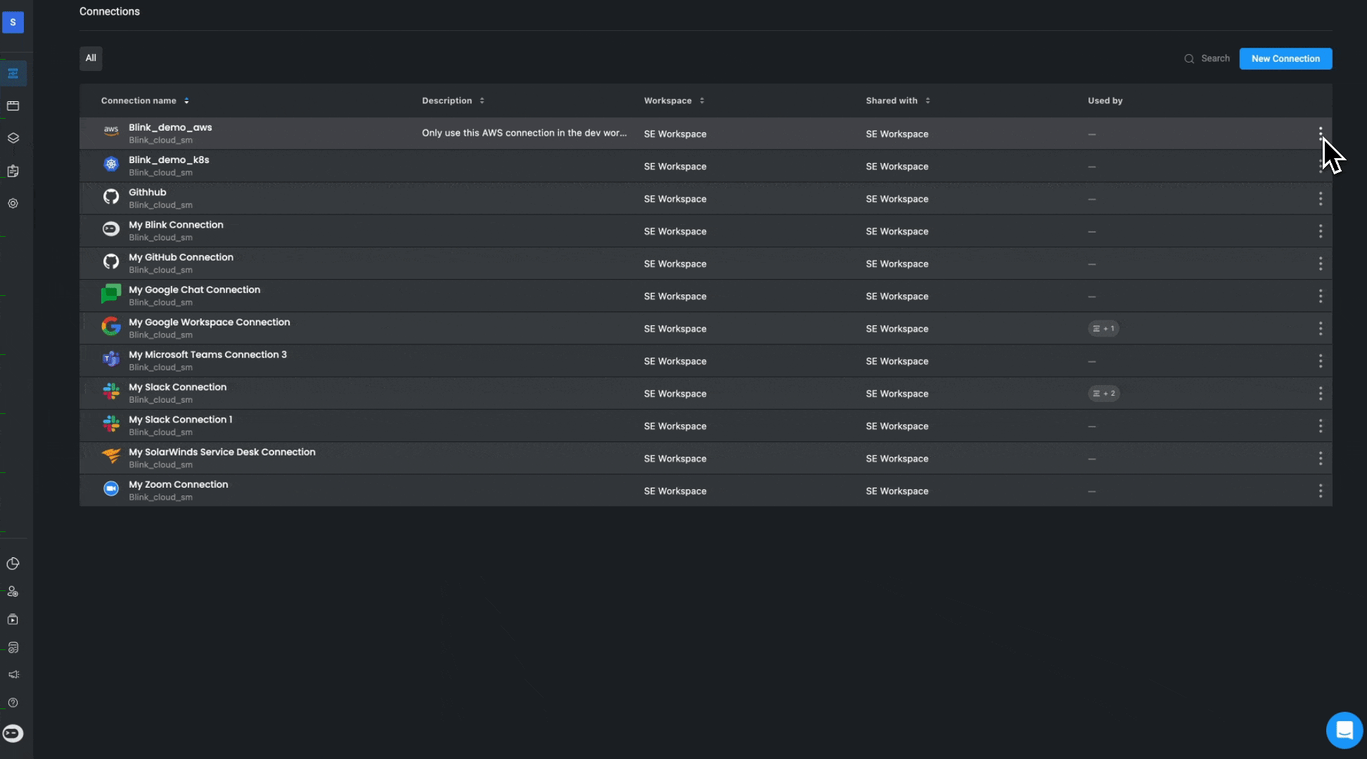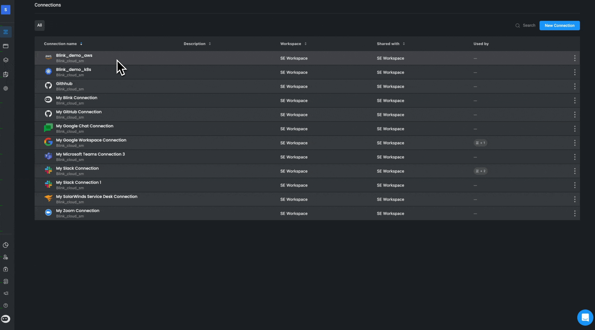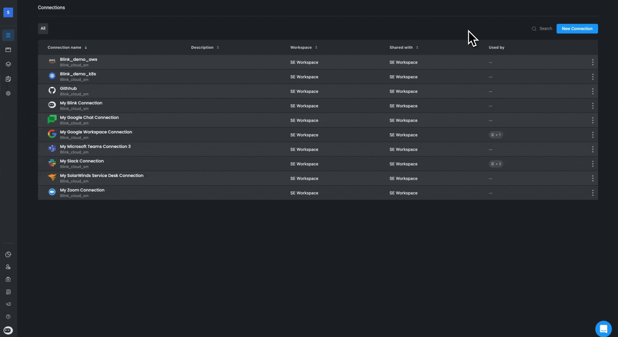 Navigate to the Connections page in the Blink’s platform. You will see a table listing all existing connections in your workspace.