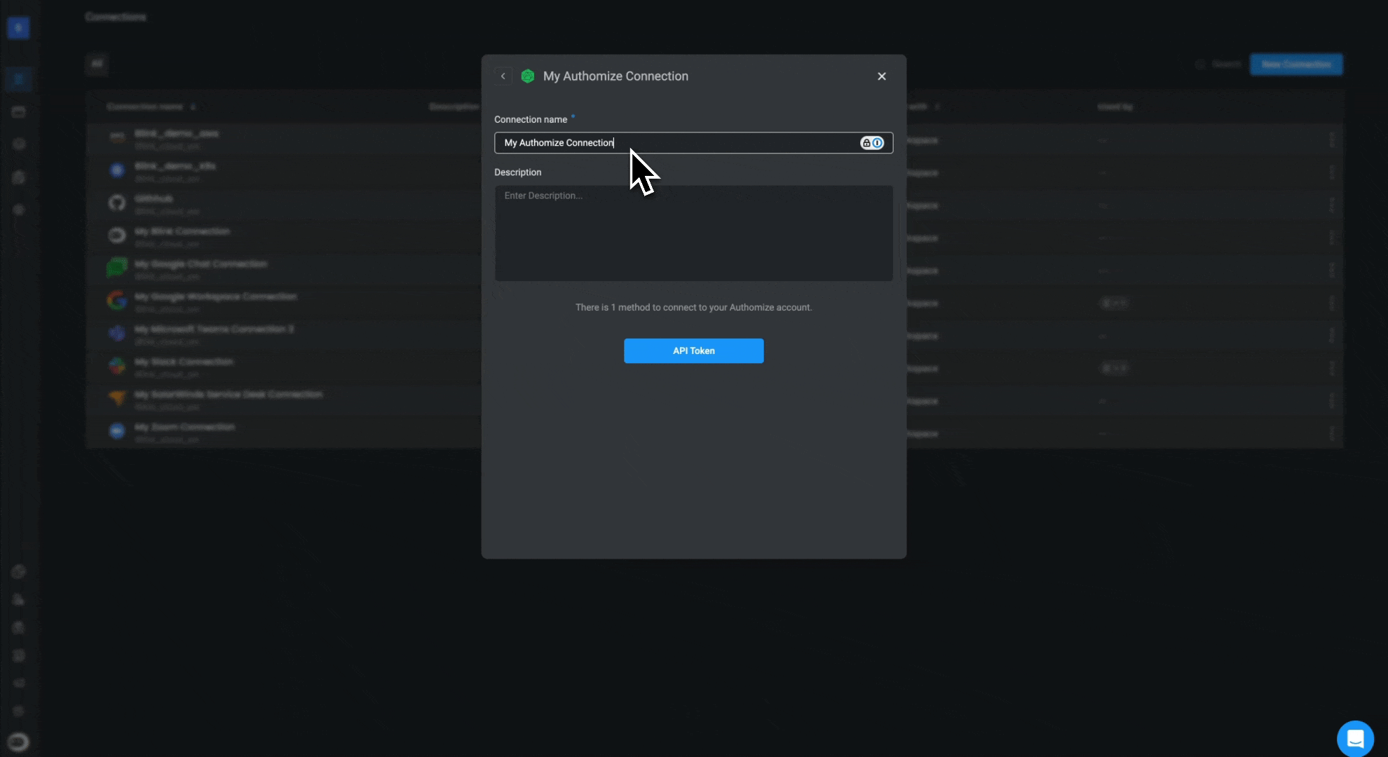 To create a new connection, click ’+ Create New Connection’ The New Connection dialog will appear, displaying the available methods for the selected service.