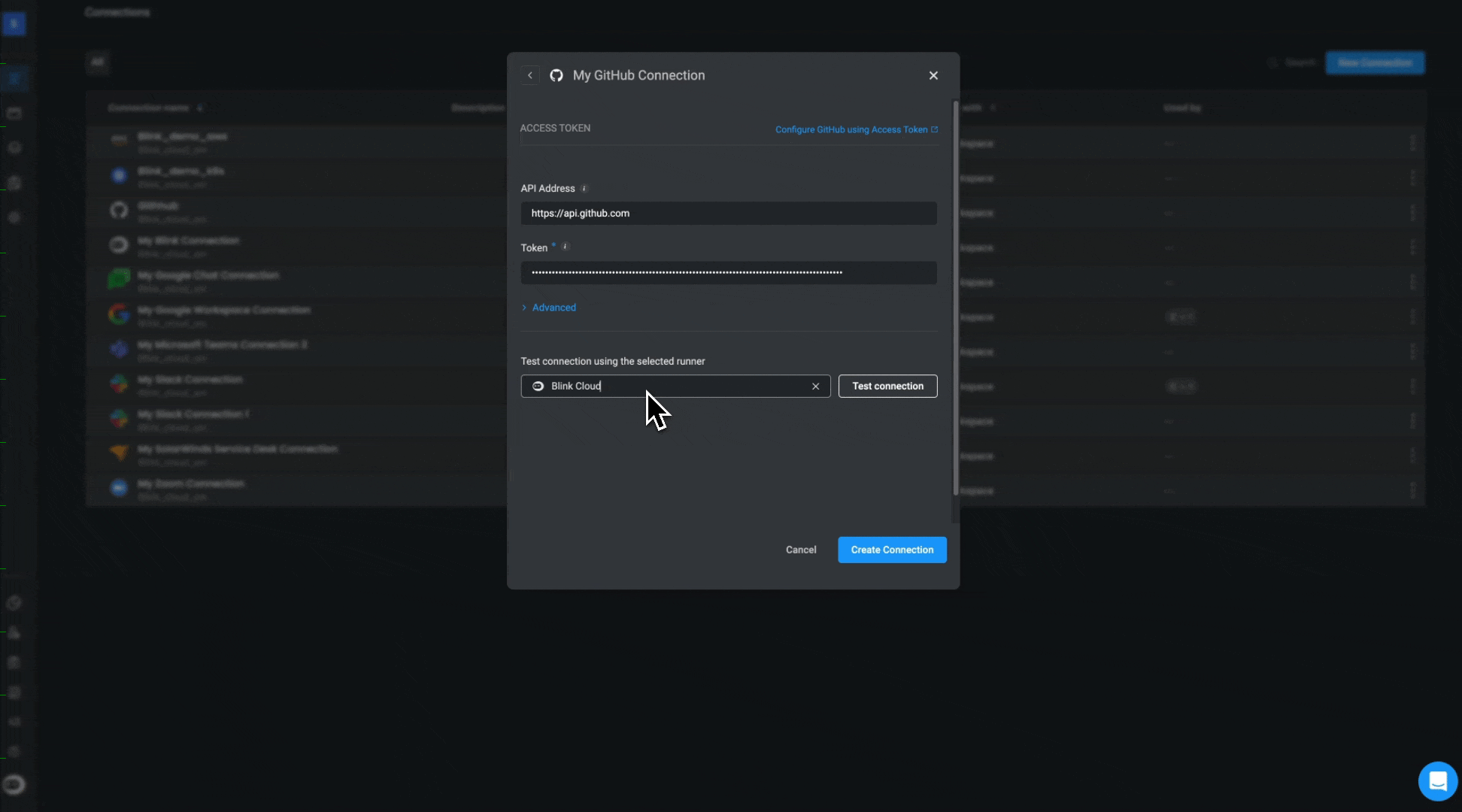 Select the runner with which to test the connection. The default runner is Blink Cloud.