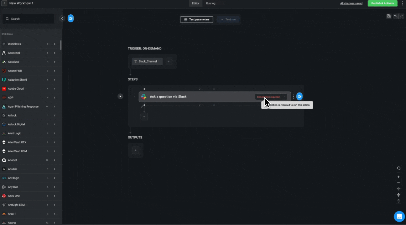 In the Workflow Editor, navigate to a step that requires a connection. Click Select connection, then choose an existing connection or create a new one.
