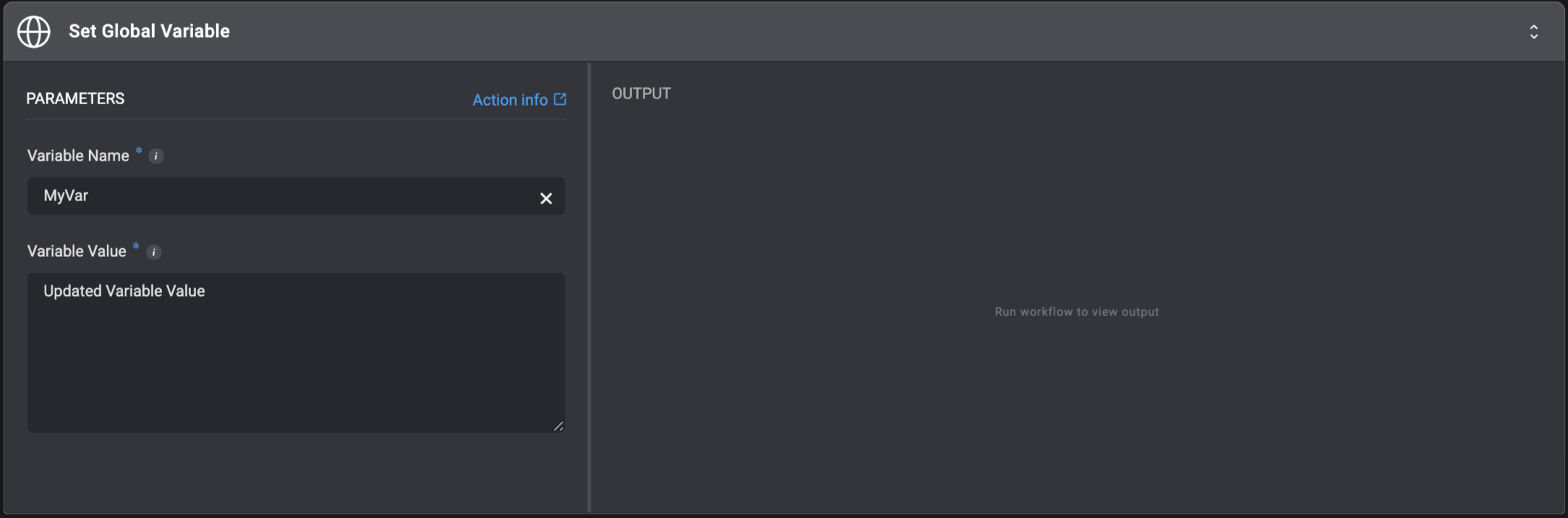 | Variable Name | The name of the new/existing global variable. Once created/updated, it is available for all Workflows in a workspace. |