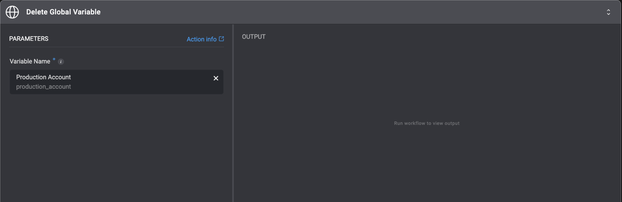 | Variable Name | The name of the global variable to delete. Once deleted, it is not available for all other Workflow in a workspace. |