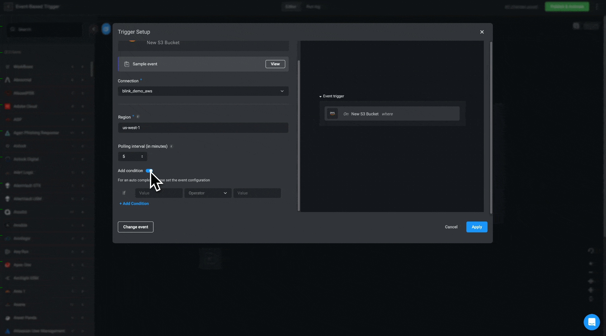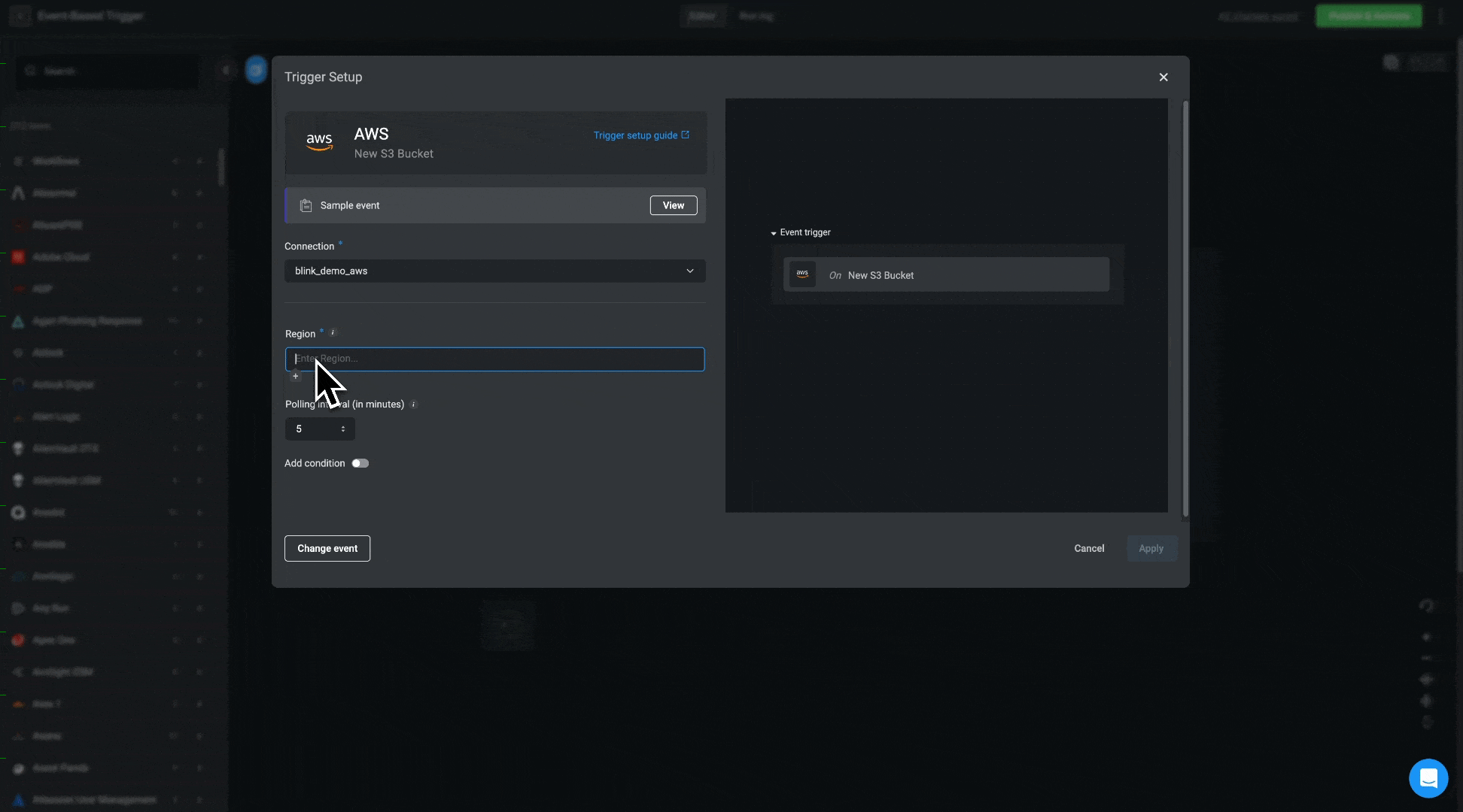 The rest of this article explains how to configure event-based triggers with any available Blink connection, focusing primarily on events that do not include webhook configuration.For detailed information, use cases, and instructions about webhooks, see Configuring Event-Based Triggers with Webhooks.