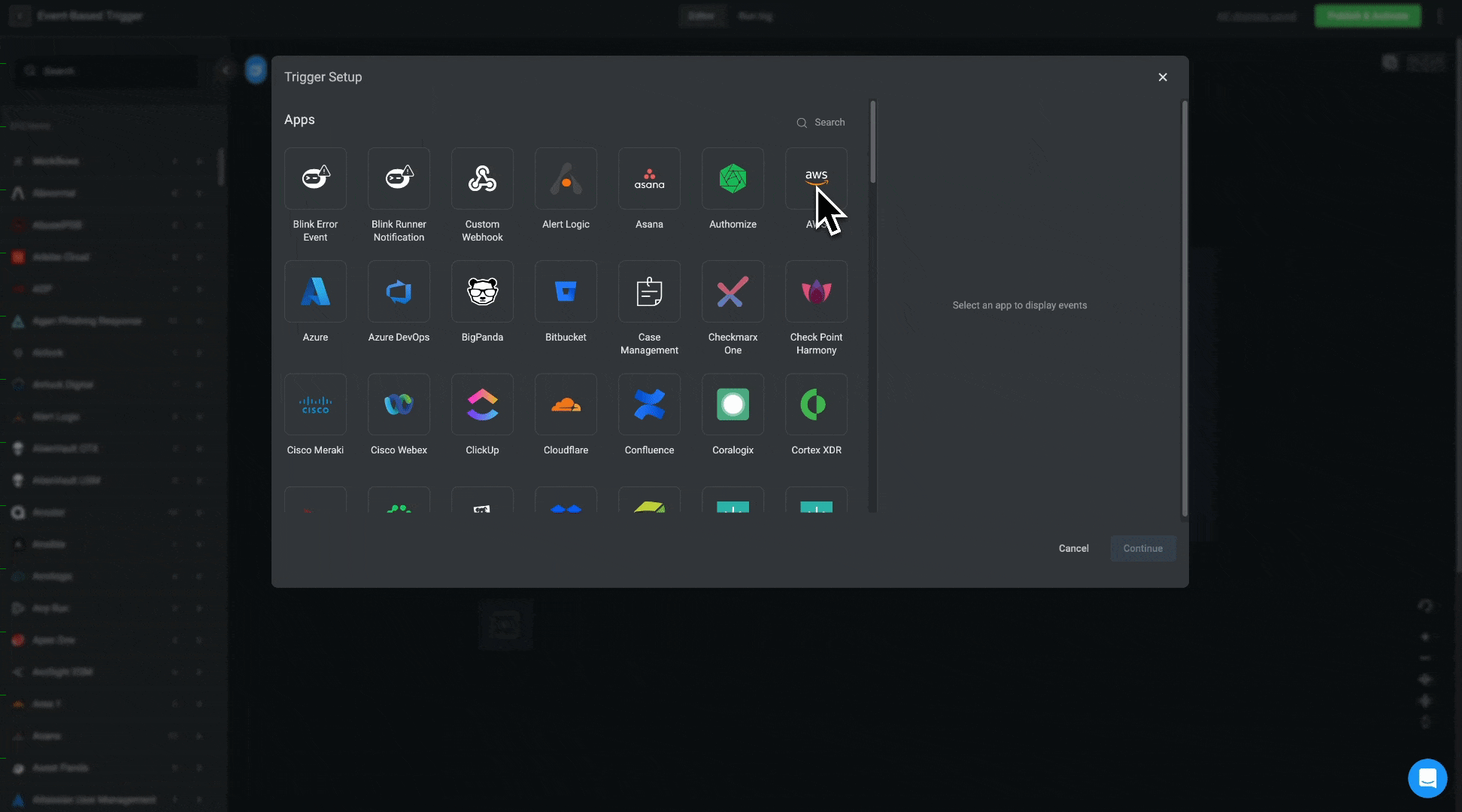 From the right panel, select a supported out-of-the-box event (any event that is not a Webhook) and click Continue. The Trigger Setup popup loads all relevant parameters based on the event you chose.