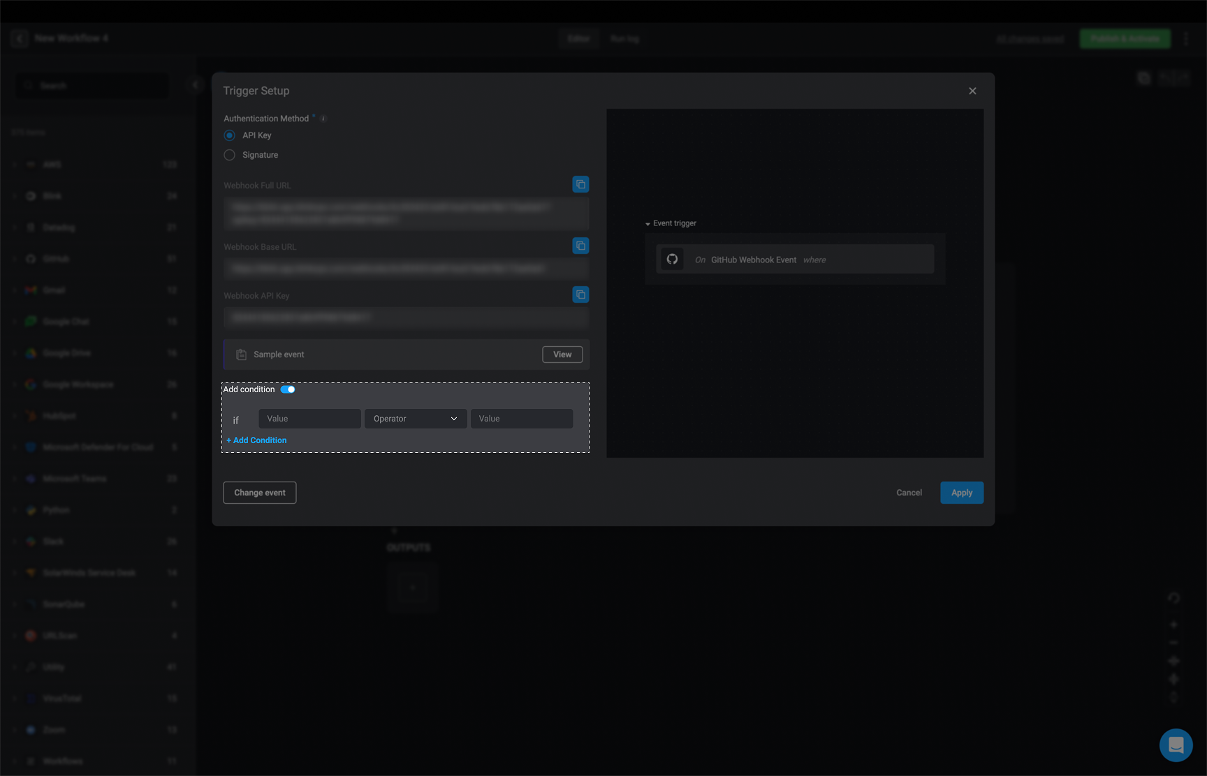 When configuring your workflow, consider validating payloads to ensure they match expected structures. This helps prevent malformed or malicious payloads from triggering the workflow and prevents errors when the workflow runs.Configure a Webhook