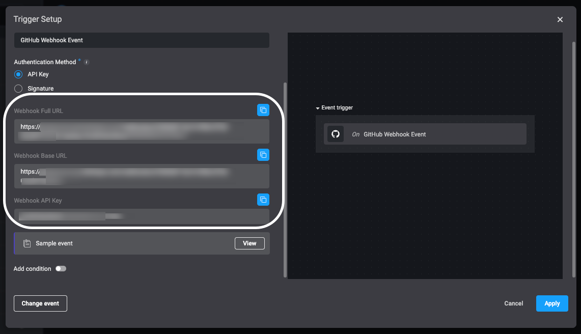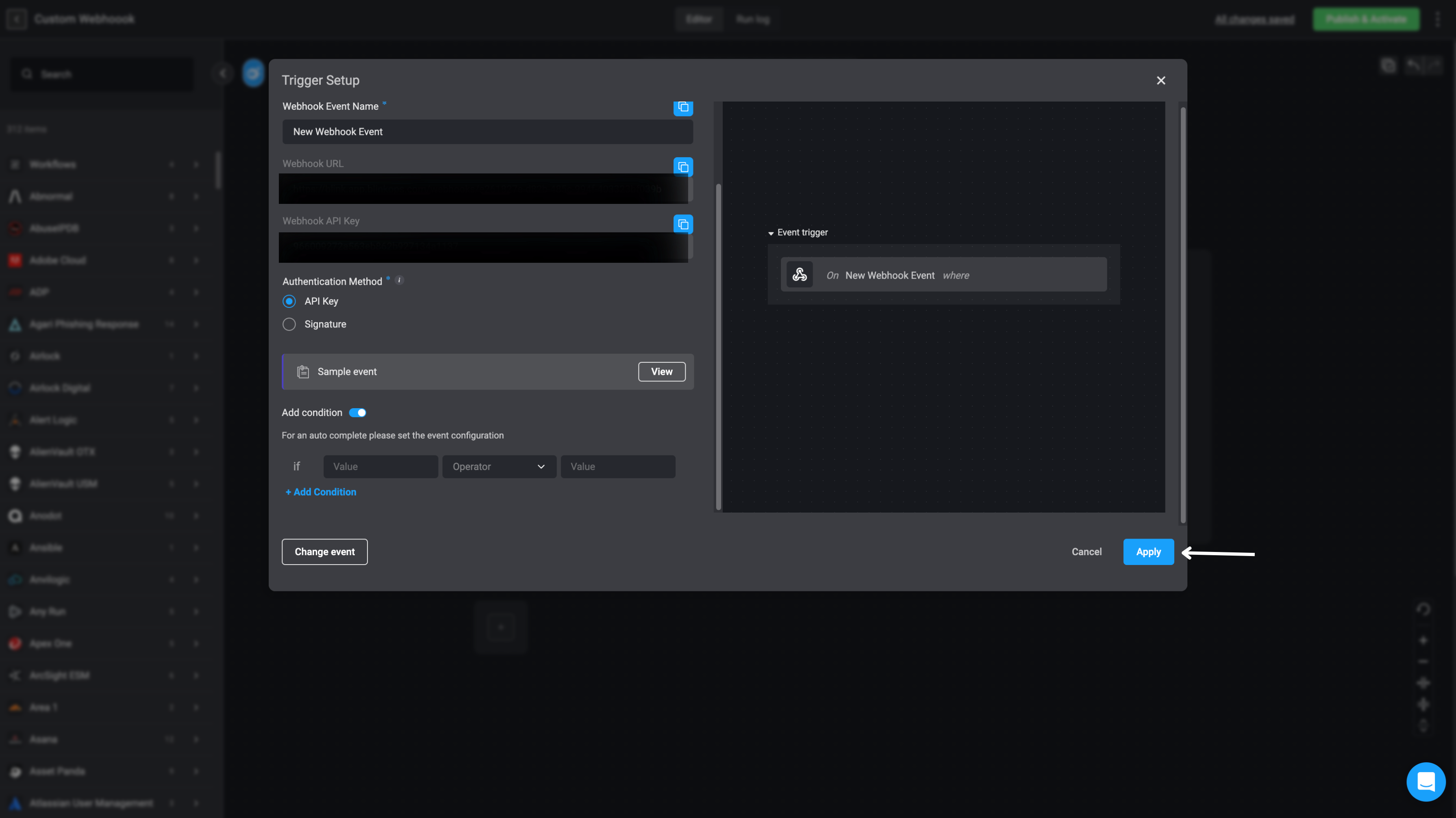 a. Configure the webhook, providing the webhook URL and API key in the relevant fields.