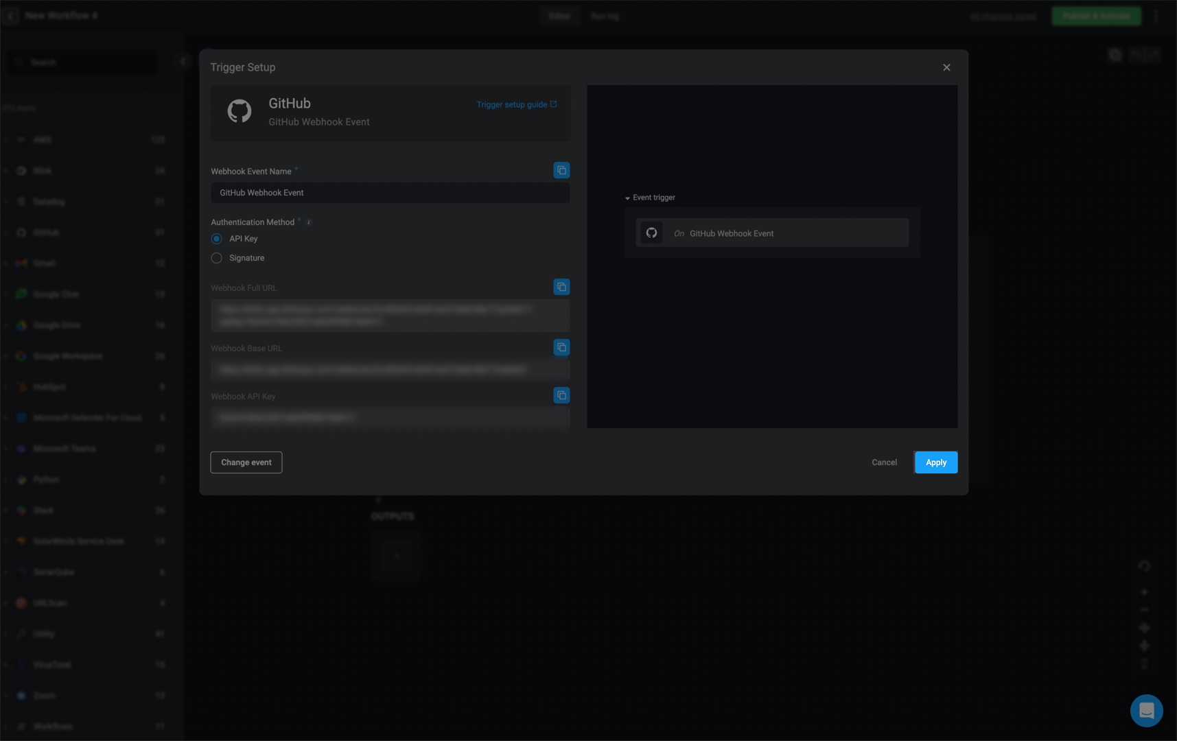 Following is a description of the fields displayed in the Trigger Setup popup:API Key is selected as the authentication method. The Webhook Event Name, Webhook API Key, Webhook Full URL, and Webhook Base URL are displayed in their respective fields.