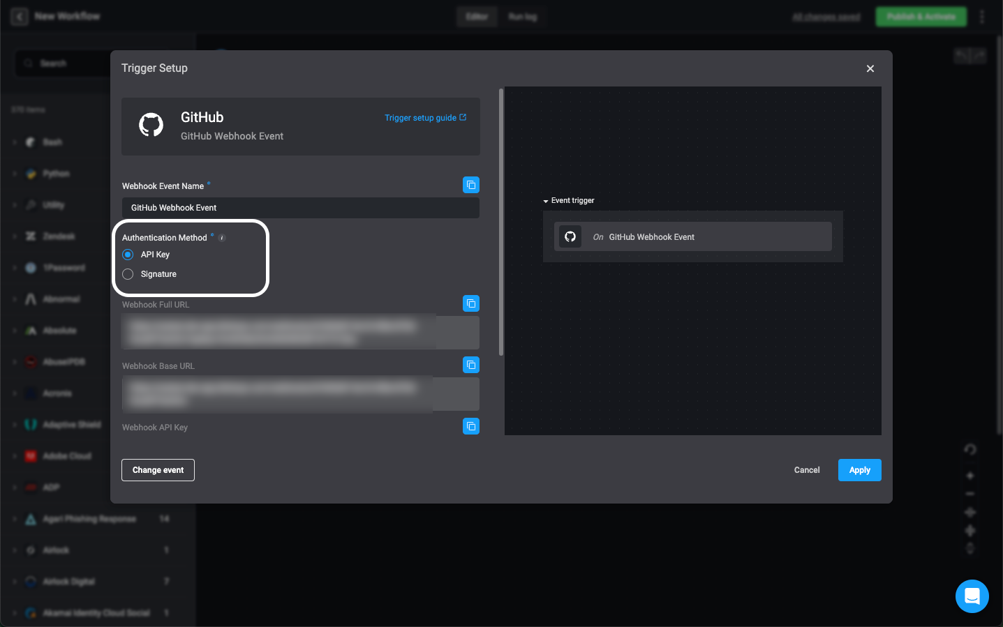 API Key is selected as the authentication method. The Webhook Event Name, Webhook API Key, Webhook Full URL, and Webhook Base URL are displayed in their respective fields.Field Description Webhook Event Name The name assigned to the webhook event. By default, the Webhook Event Name is automatically set based on the connection you selected. You can modify this name to make it more descriptive. For example, Webhook: Retrieve All Events. Authentication Method The authentication type used: API Key or Signature authentication. Webhook Full URL The complete URL where events are sent. If using API Key Authentication, this URL includes the API key as a query parameter, and the external vendor system must send requests to this exact URL. No additional authentication headers are required. This field is not displayed when you choose the Signature authentication method. Webhook Base URL The core webhook endpoint without query parameters. This is used for Signature Authentication, where the external vendor system generates a cryptographic signature before sending requests. Webhook API Key The API key used for authentication. This is only applicable when using API Key Authentication and is embedded in the Webhook Full URL. -