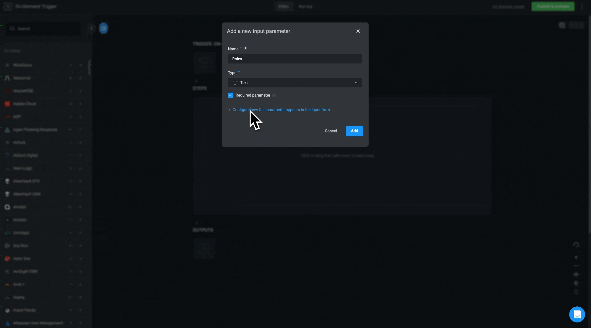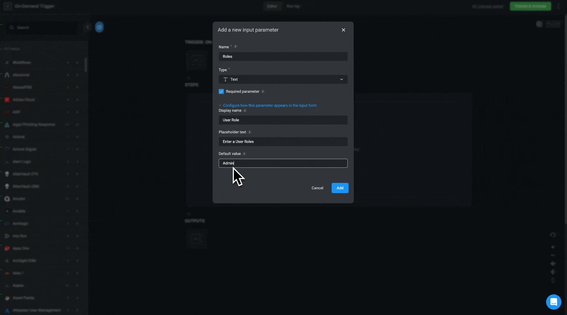 To customize how the input appears in the form, click Configure how this parameter appears in the input form and modify the Display name, Placeholder text, and Default value.