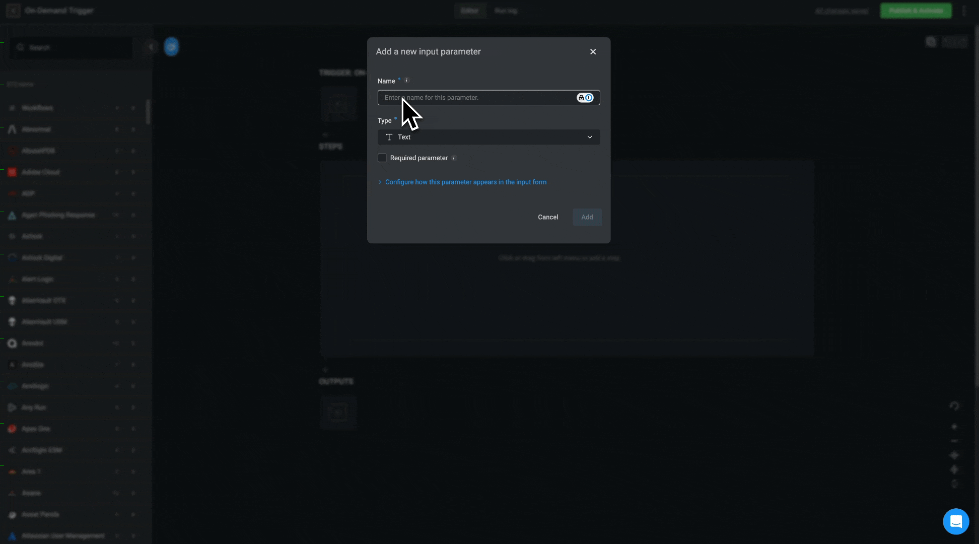 Enter a memorable name for the trigger and enter the type. Optionally, mark the Required parameter checkbox.