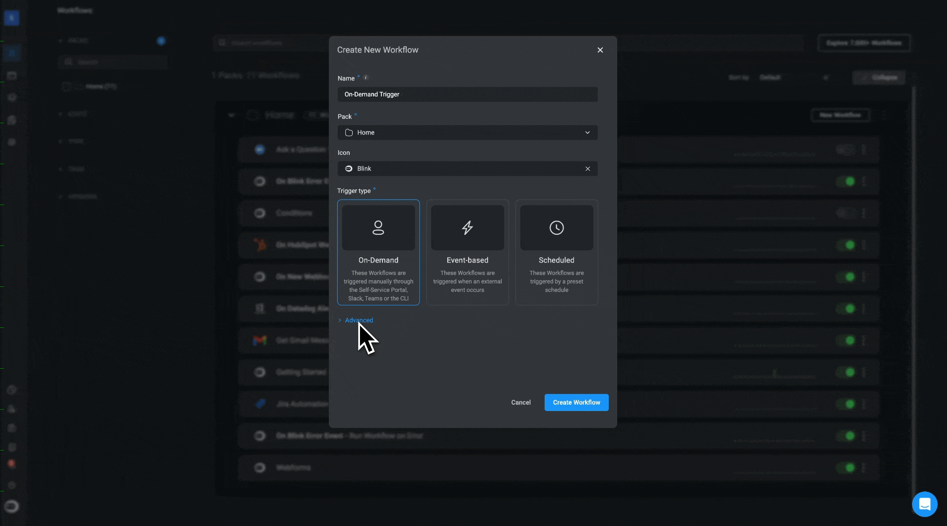 In the Workflow Editor, locate the Trigger: On-Demand section and click + to configure when triggering the workflow.