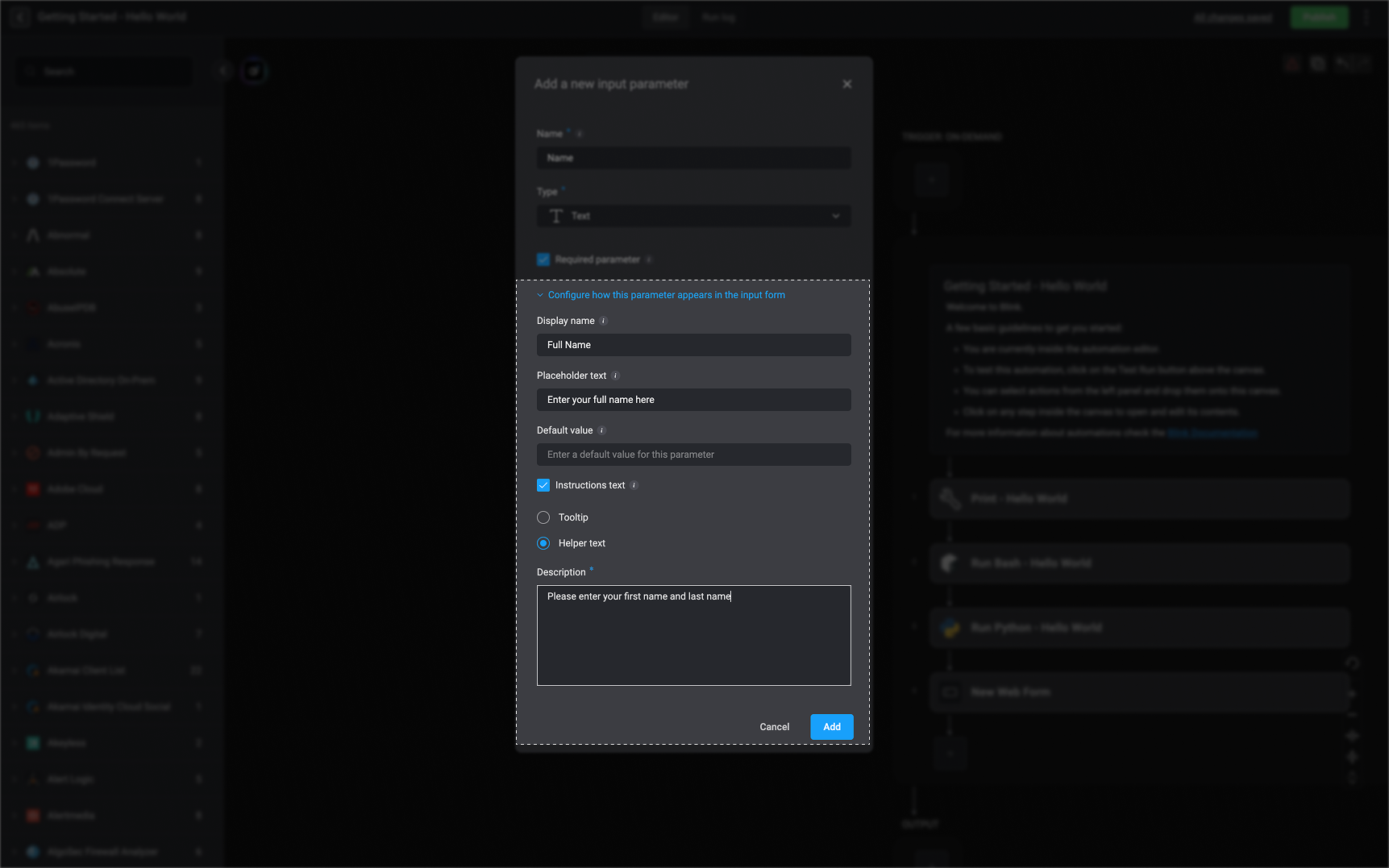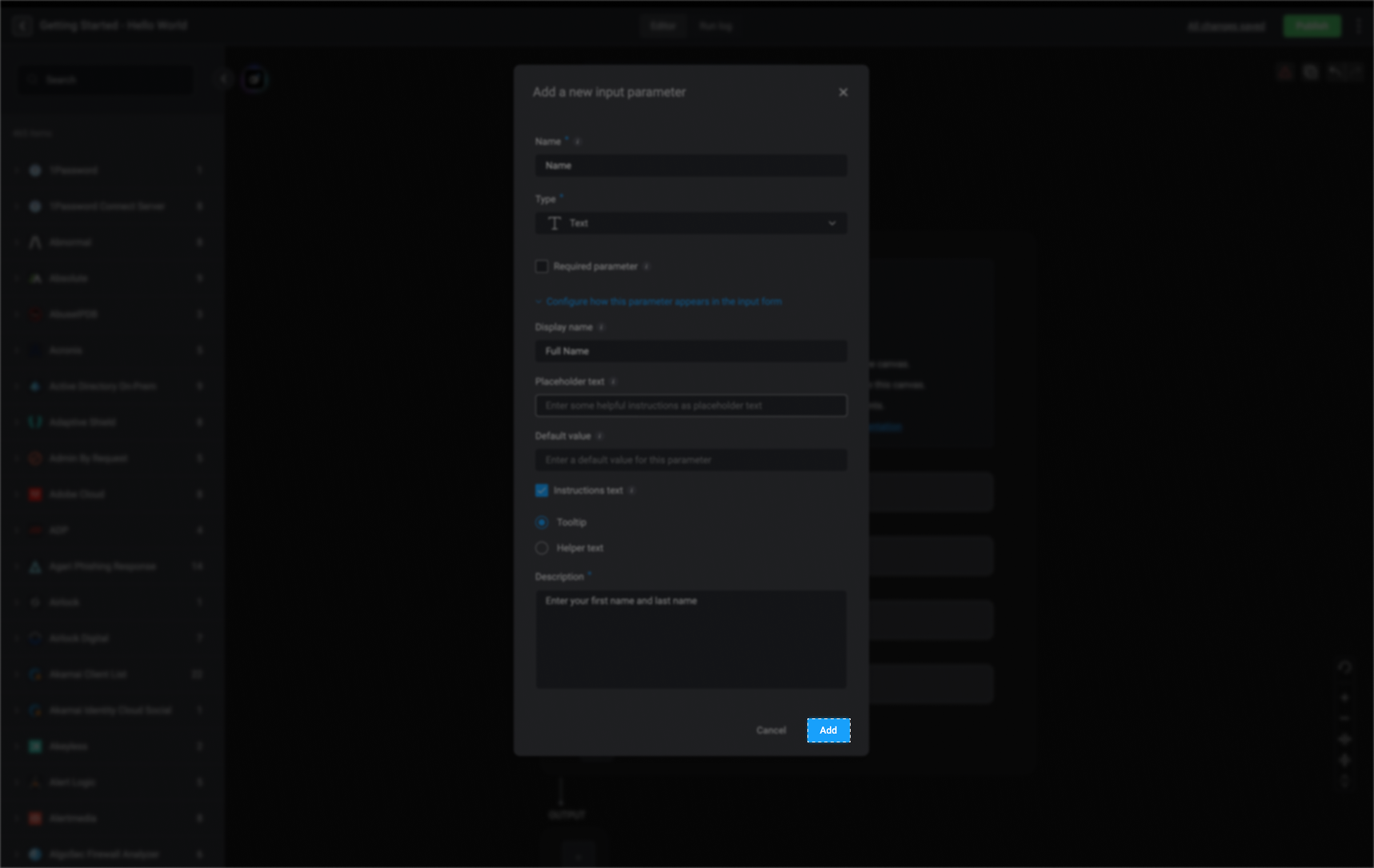 | Instructional Text | When enabled, this text is displayed as the tooltip or helper text for this input parameter field |