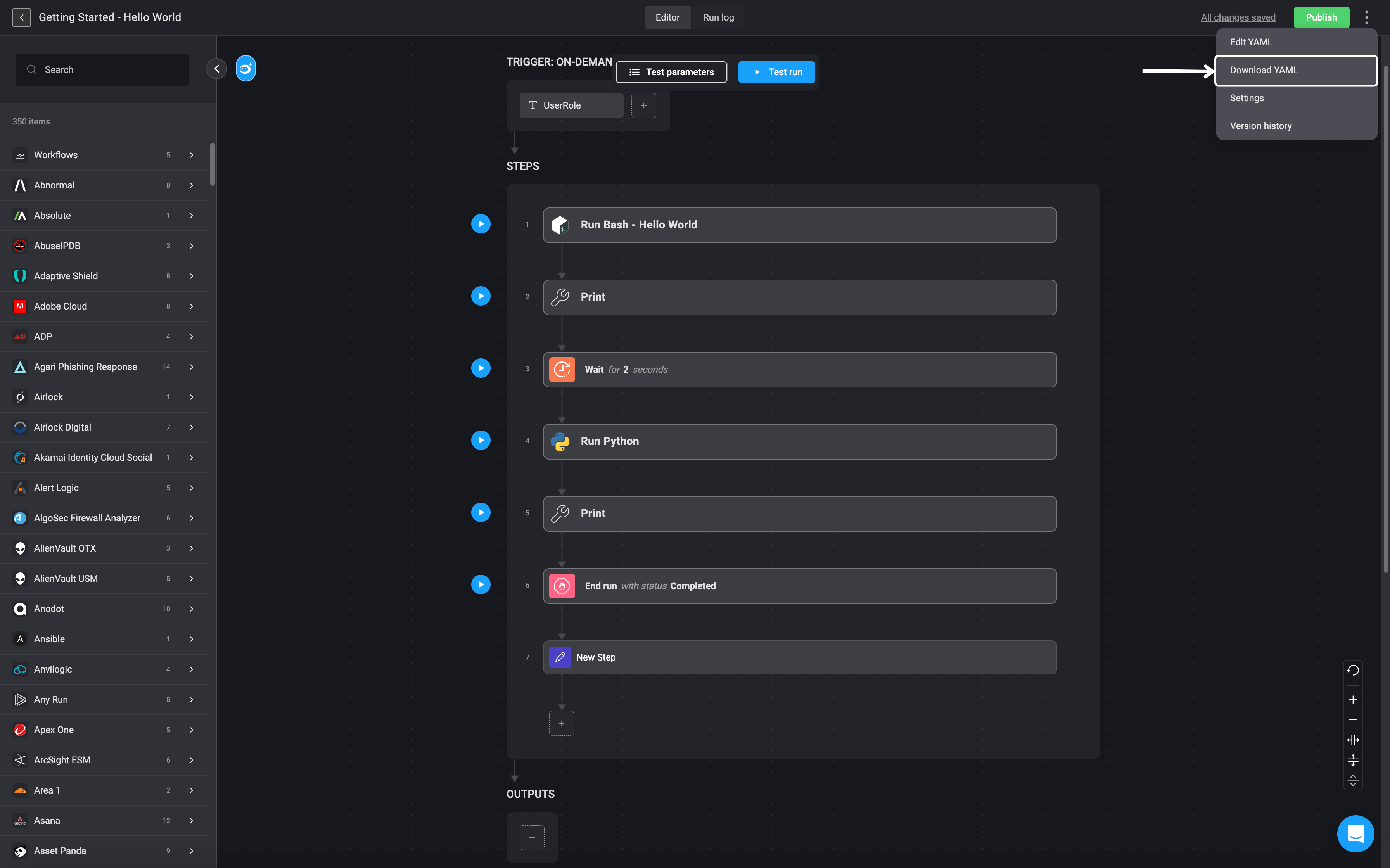 - In the Workflow Editor, in the top-right corner, click the icon and then select the Download YAML option .