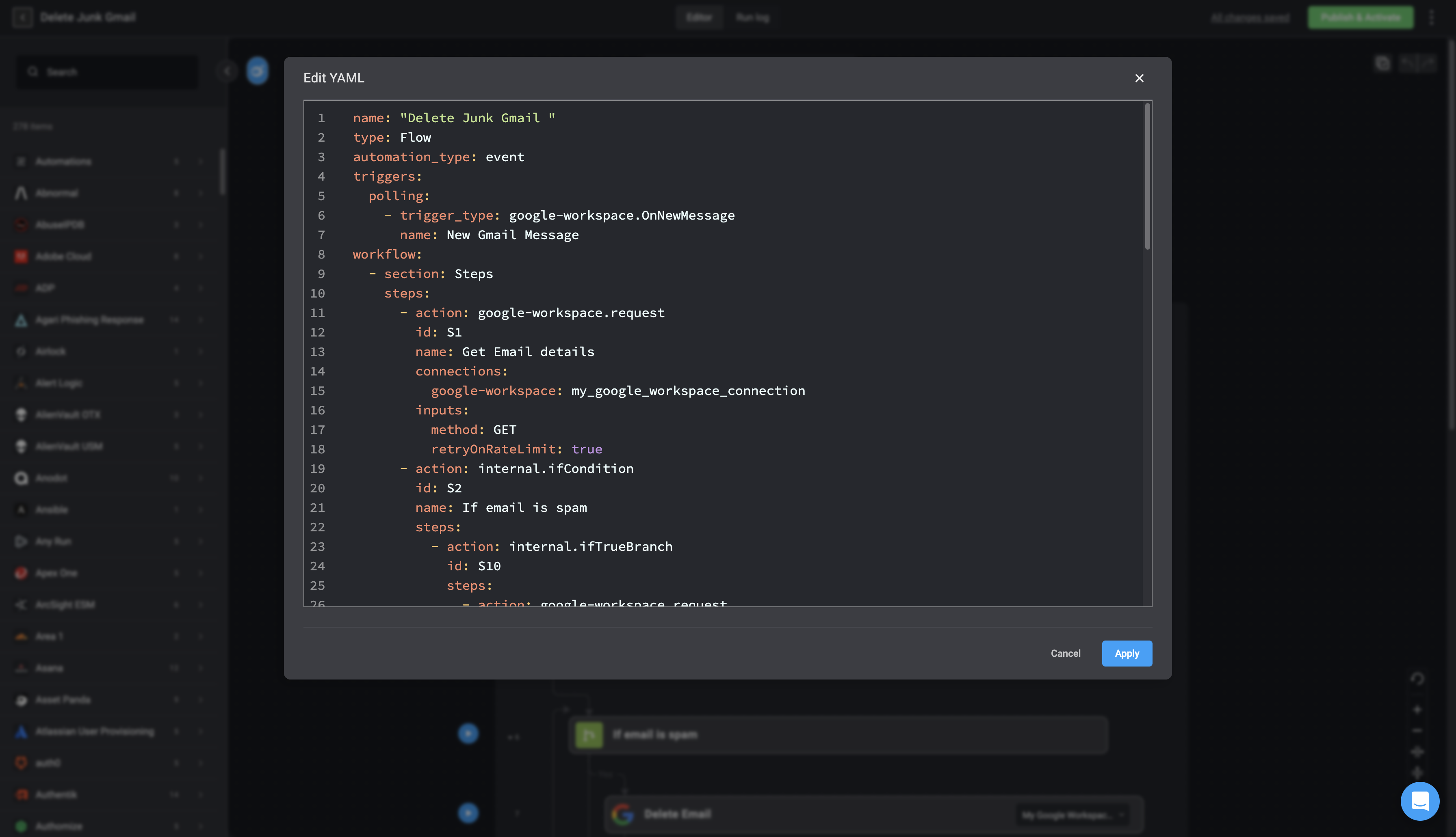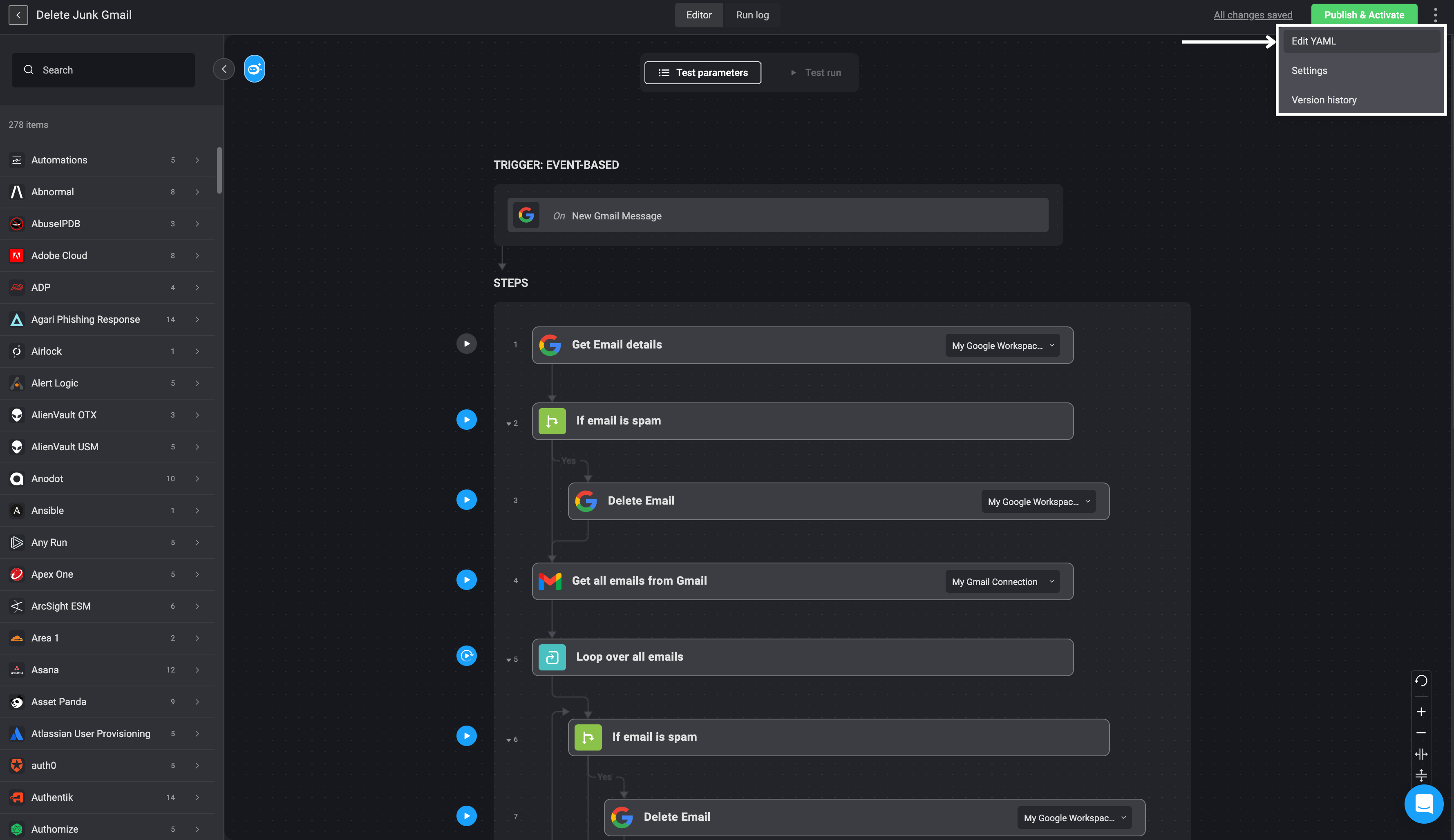 - In the Workflow Editor, in the top-right corner, click the icon and then select the Edit YAML option . Your Workflow is presented in YAML format.