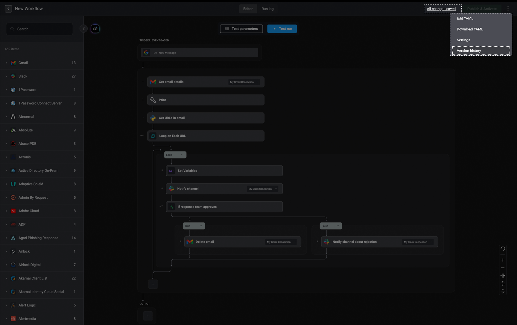 To access the Version History feature, click the menu icon in the top-right corner of the workflow editor and select the “Version History” option or you can click the “All changes saved” link, and you will be redirected to the version history interface.