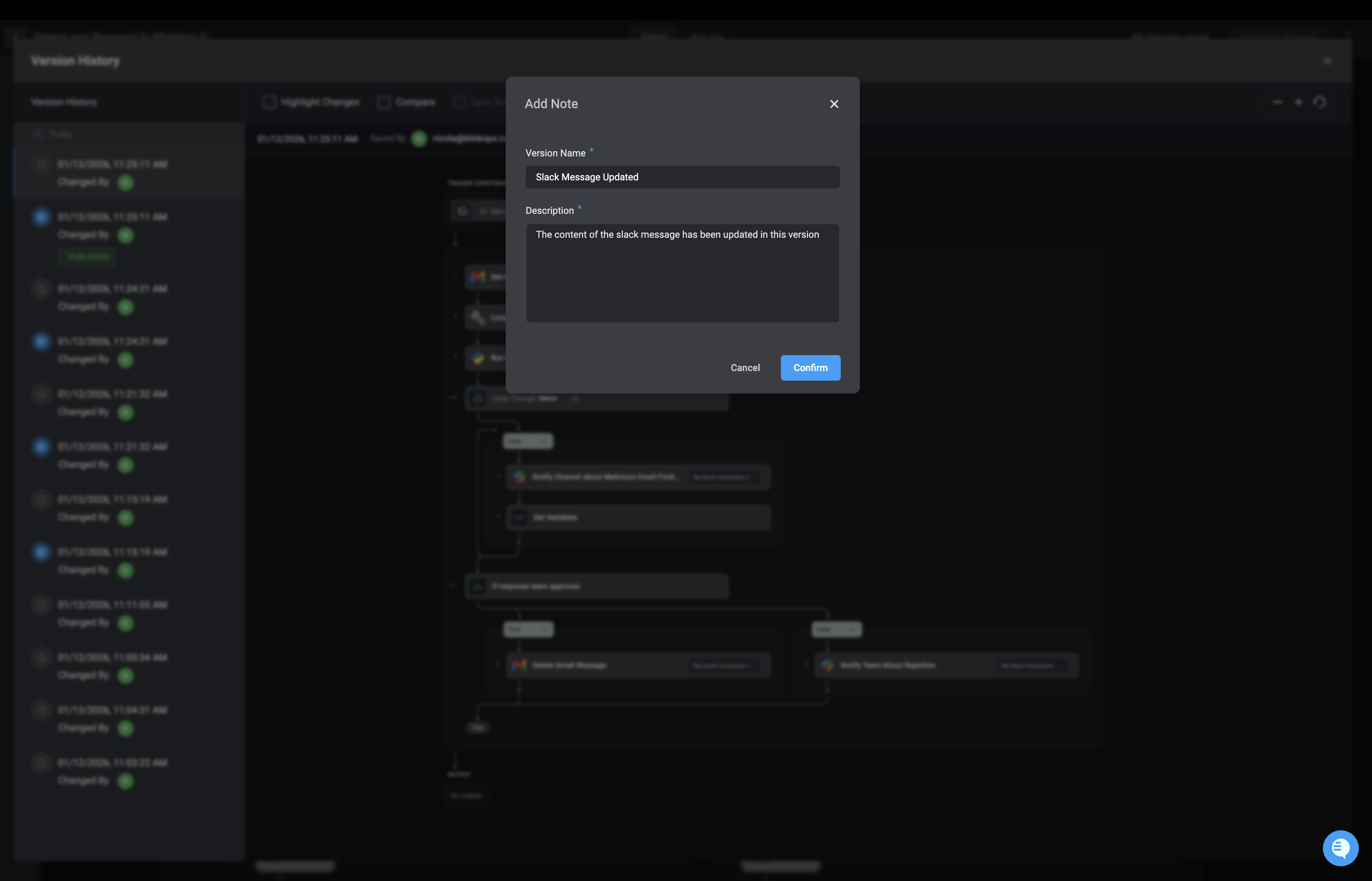 In the dialog box, provide a name and write a brief description for the selected workflow version. This helps track changes and understand the purpose of each version.