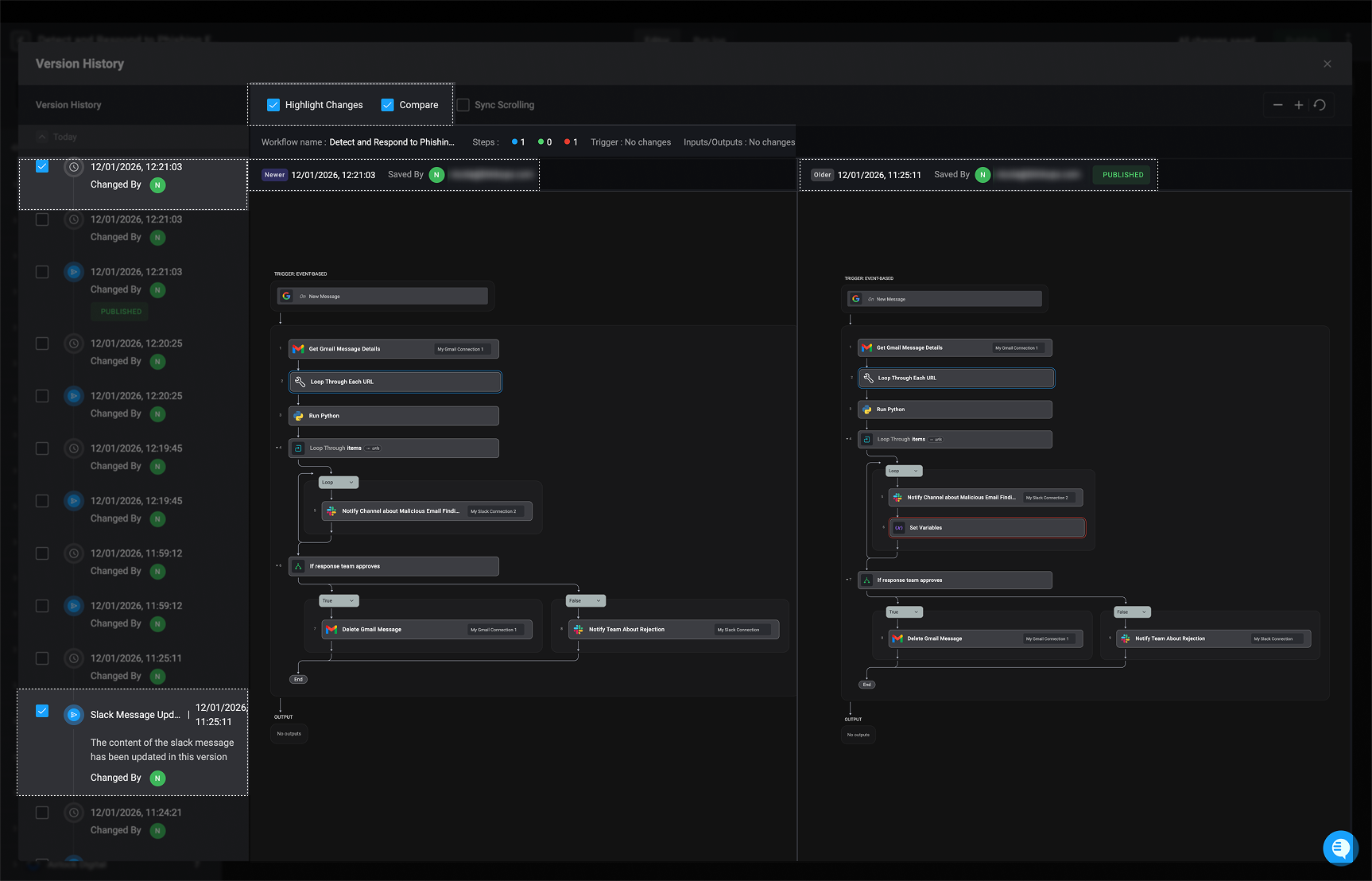 Selecting the ‘Compare’ checkbox enables a side-by-side comparison of two different workflow versions. When comparison mode is active, each version is clearly labeled with a Newer or Older indicator, making it easy to identify which version is the most recent and which represents the previous state. It also displays when the changes were made, who saved them, and whether the selected version has been published.