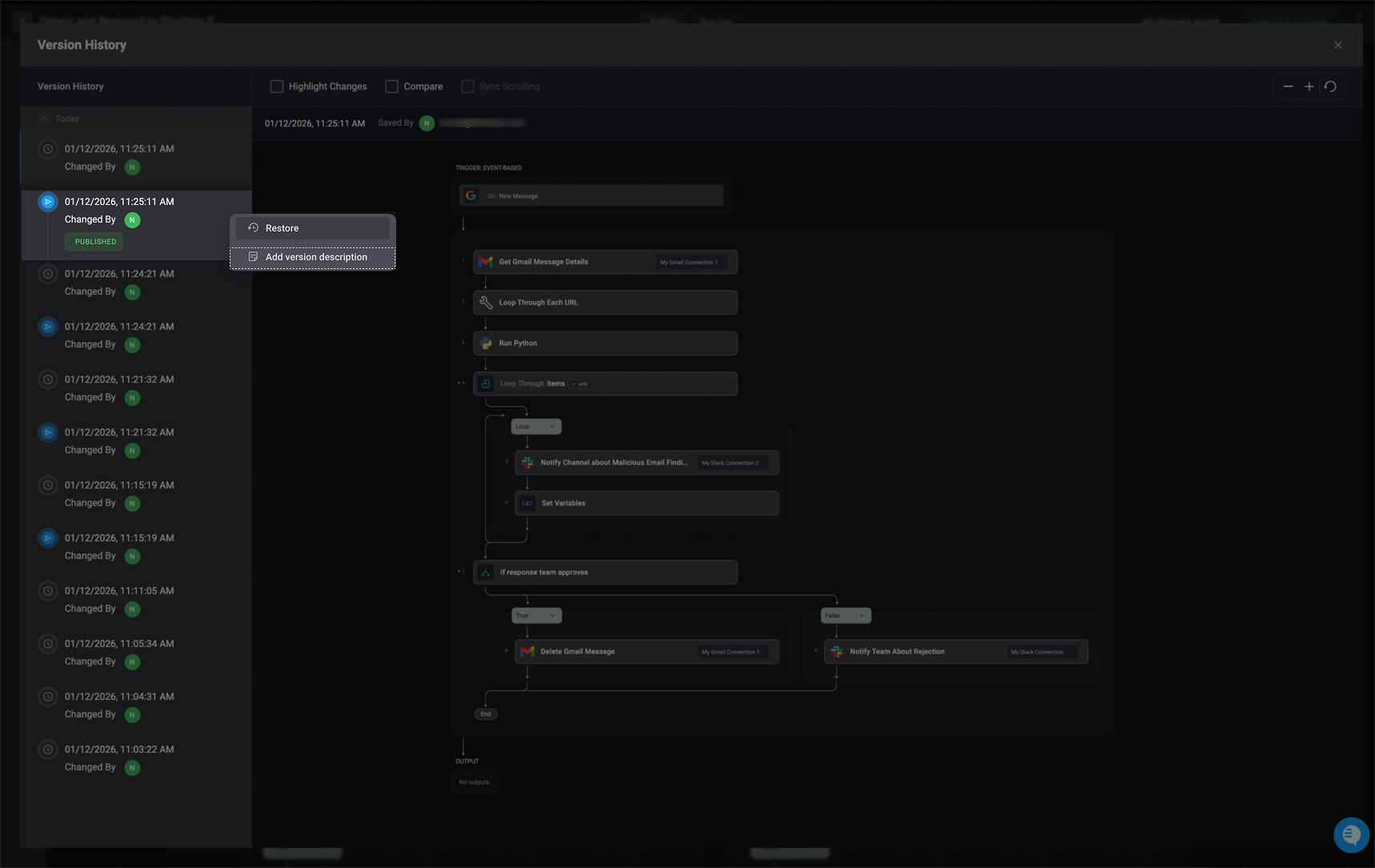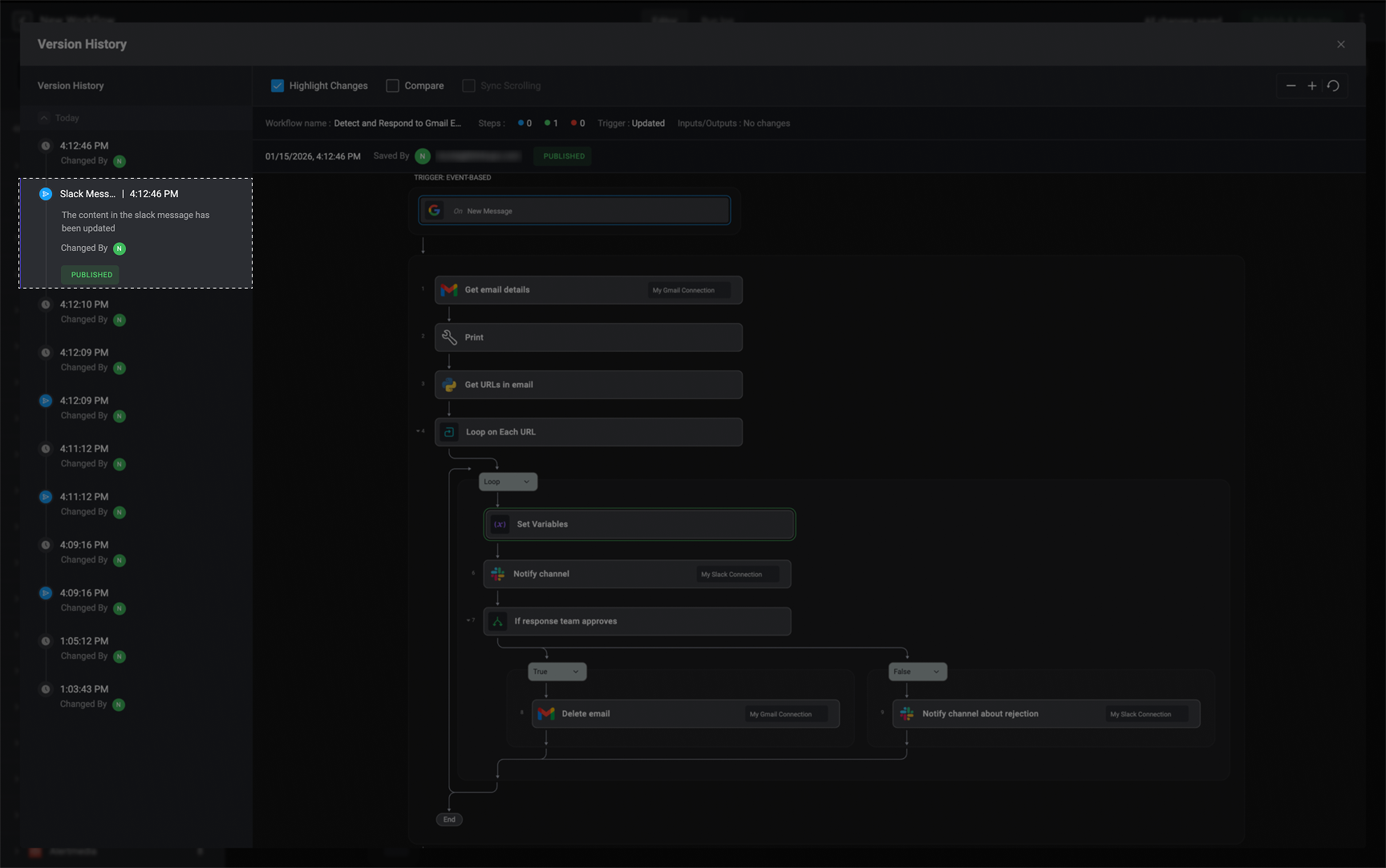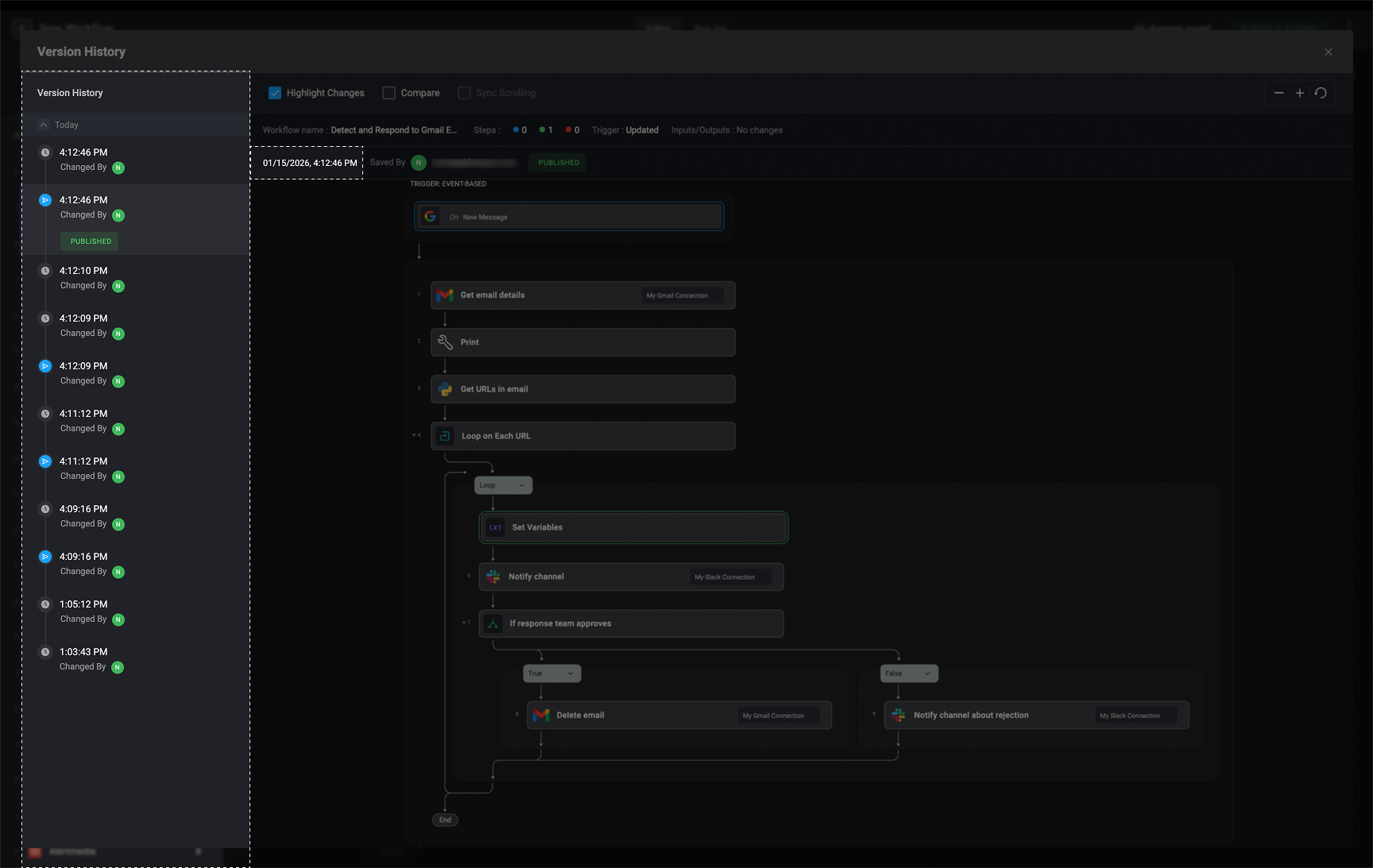 The left-hand sidebar presents a complete timeline of all workflow versions, showing when each change was made, who made it, and which versions were published, including the currently published and active workflow version. This gives you clear visibility into how the workflow has evolved over time and makes it easy to track changes and contributions.