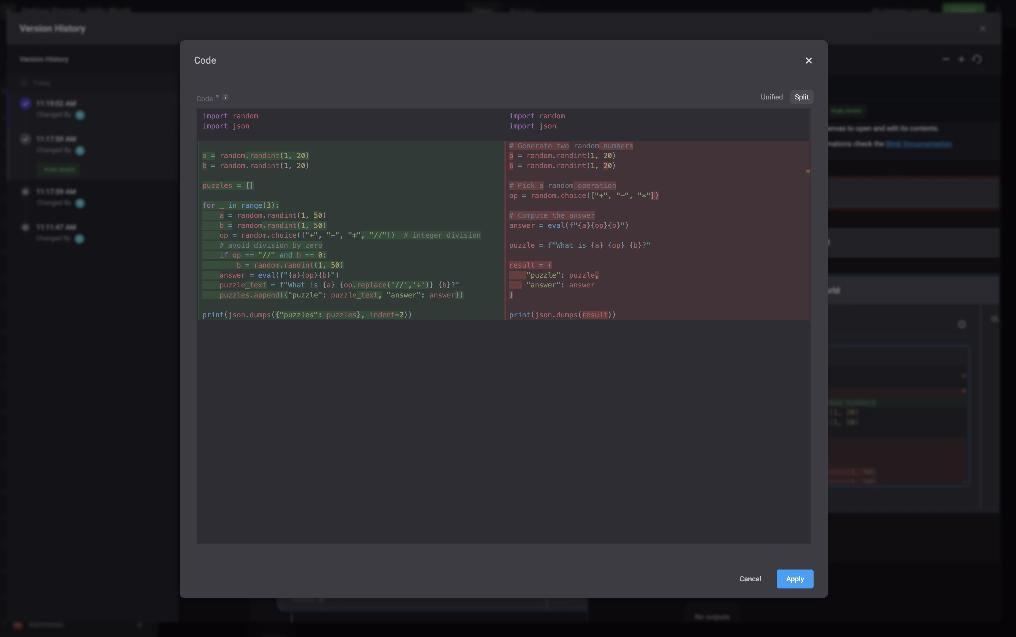 - Split Mode – Shows the original code and the updated code side by side, making it easier to compare changes line by line.