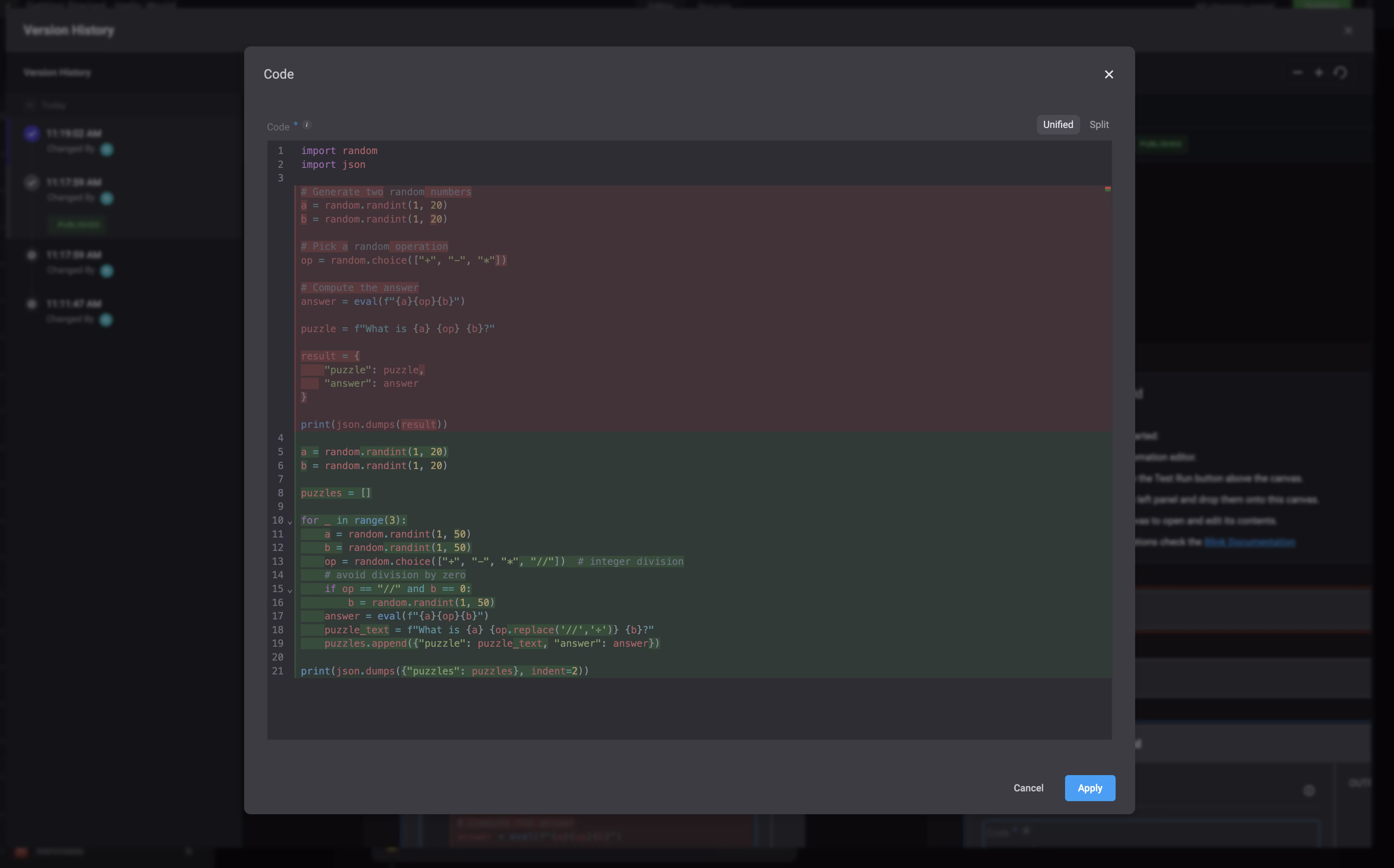 In any code action or workflow actions that contains code or script, you can easily track changes made to your code, line by line.- Green – Highlights lines of code that have been added.