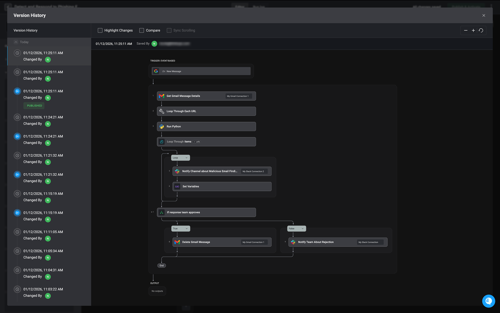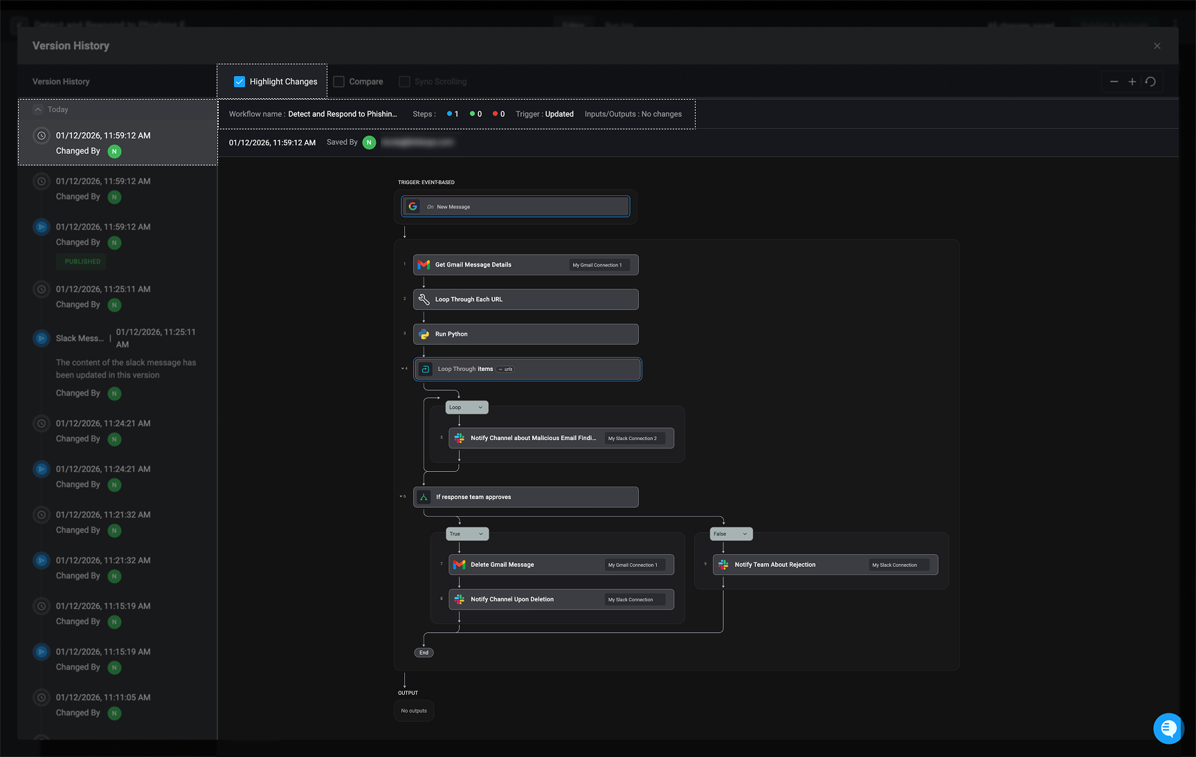 Selecting the ‘Highlight Changes’ checkbox will display the differences between the selected workflow version and the workflow version immediately preceding it.- Green – Indicates a new step, input, or output has been added to the workflow.