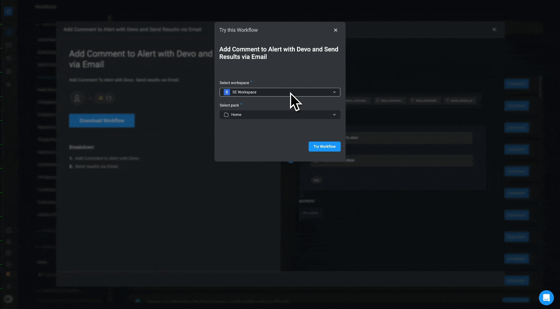 - A Try this Workflow pop-up opens. Select a Workspace and a Pack, click on the “Try Workflow” button. The default Pack is Home pack.