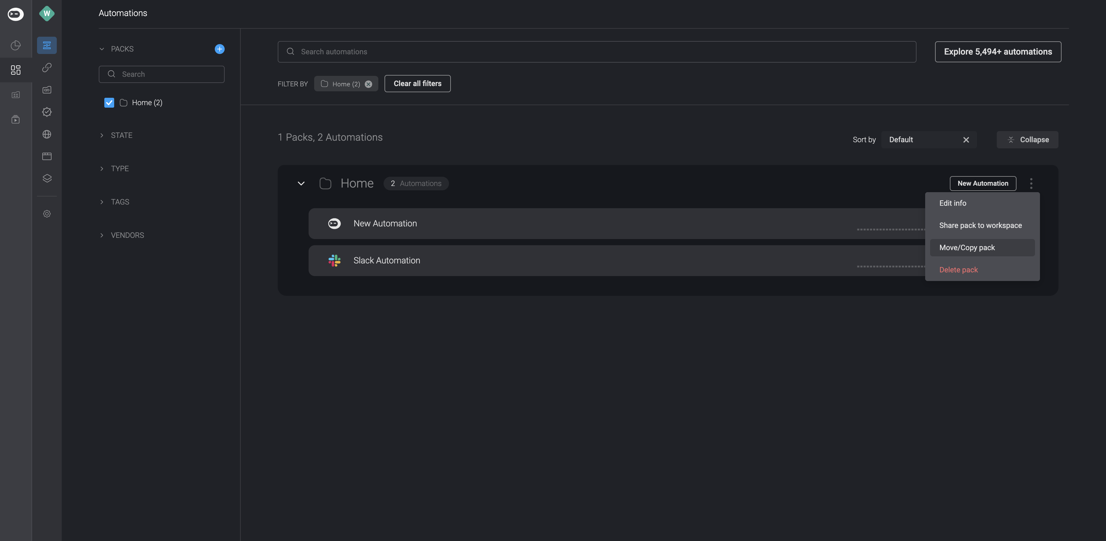 - Click on the three dots button in the top-right corner of the workflow pack and select the move/copy option.