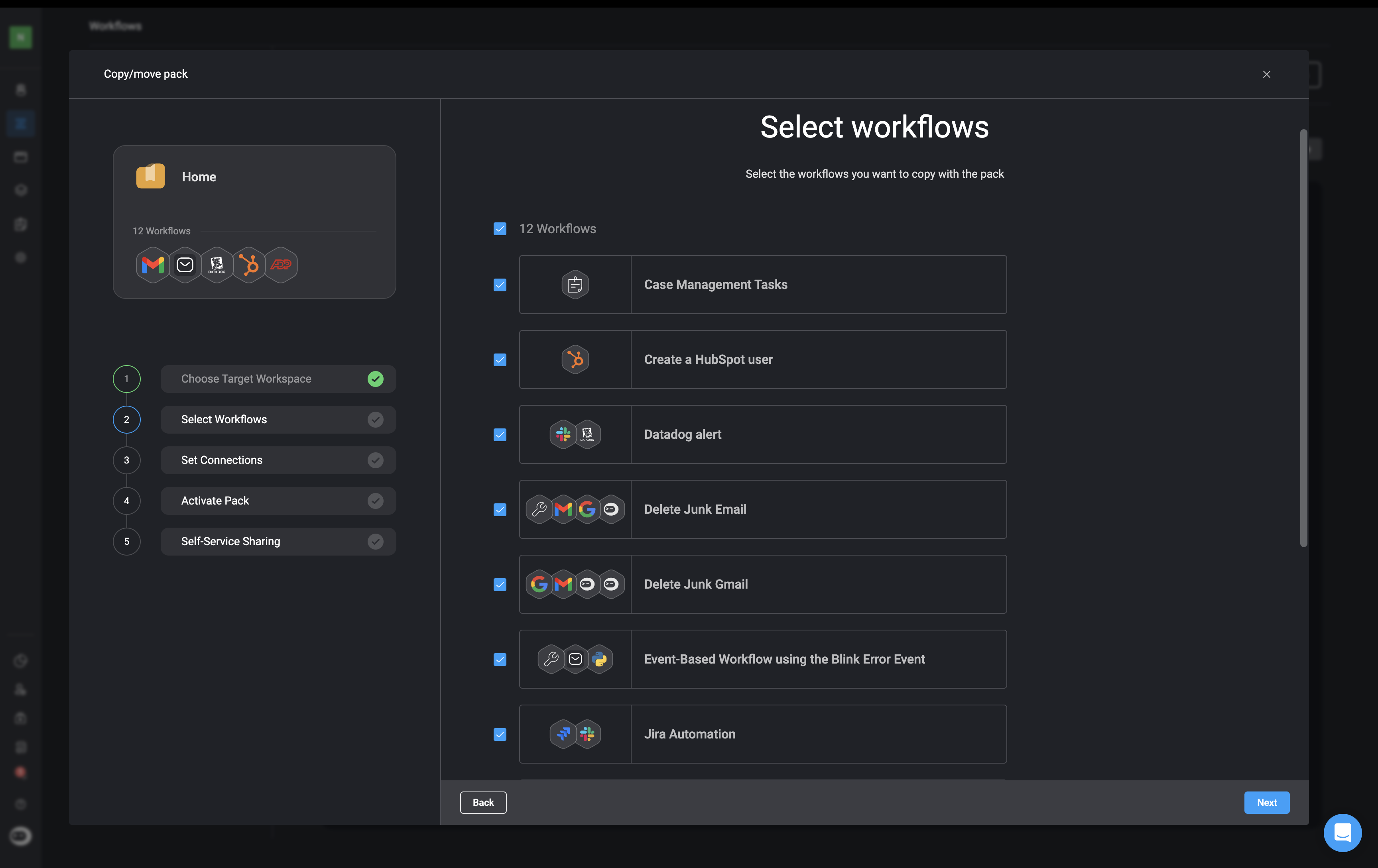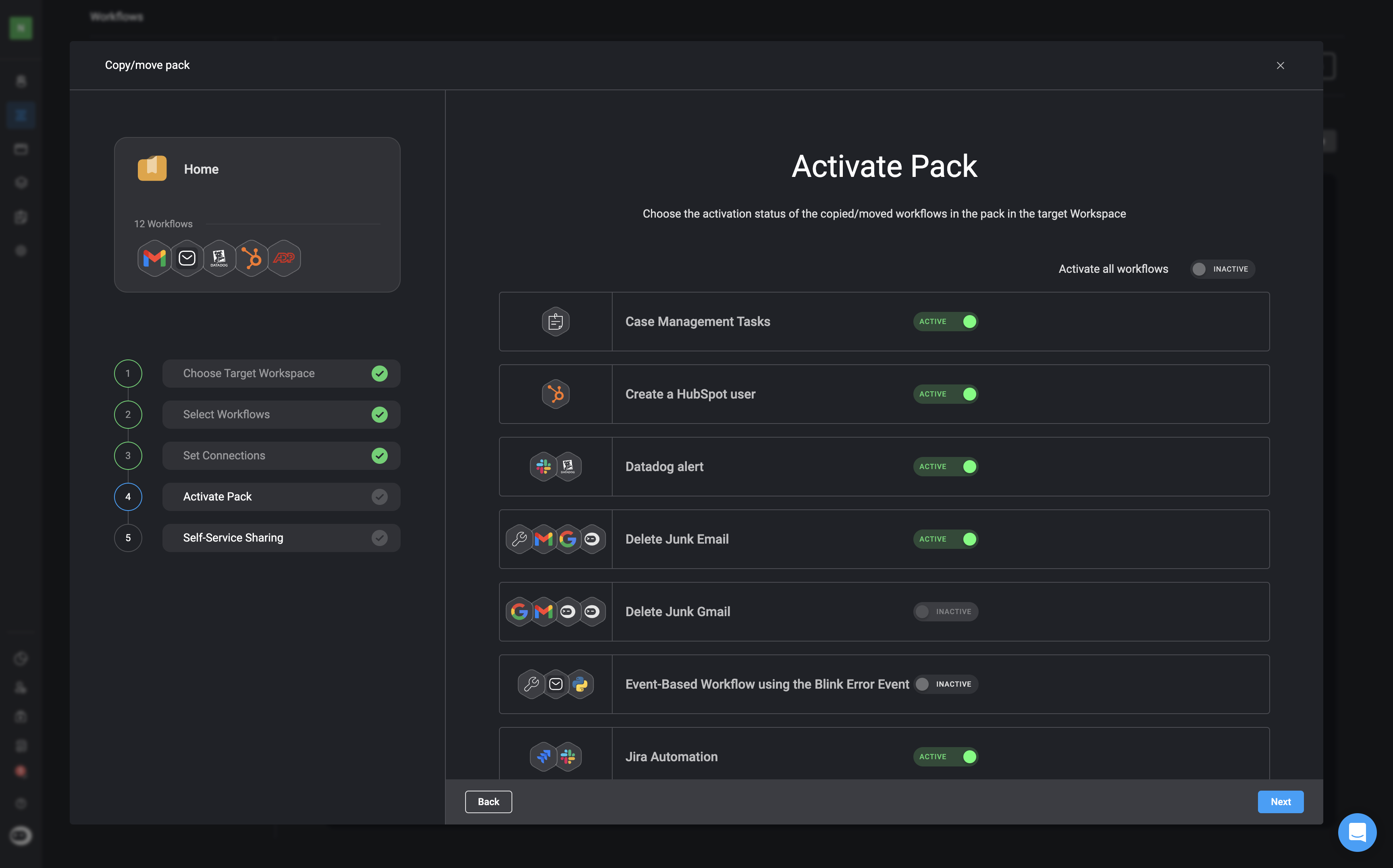 Choose the activation status of the Copied/Moved workflows in the pack in the target Workspace. You have two options: you can either Activate all workflows by clicking the toggle button next to this option or you can activate specific workflows by toggling the button next to each one individually.