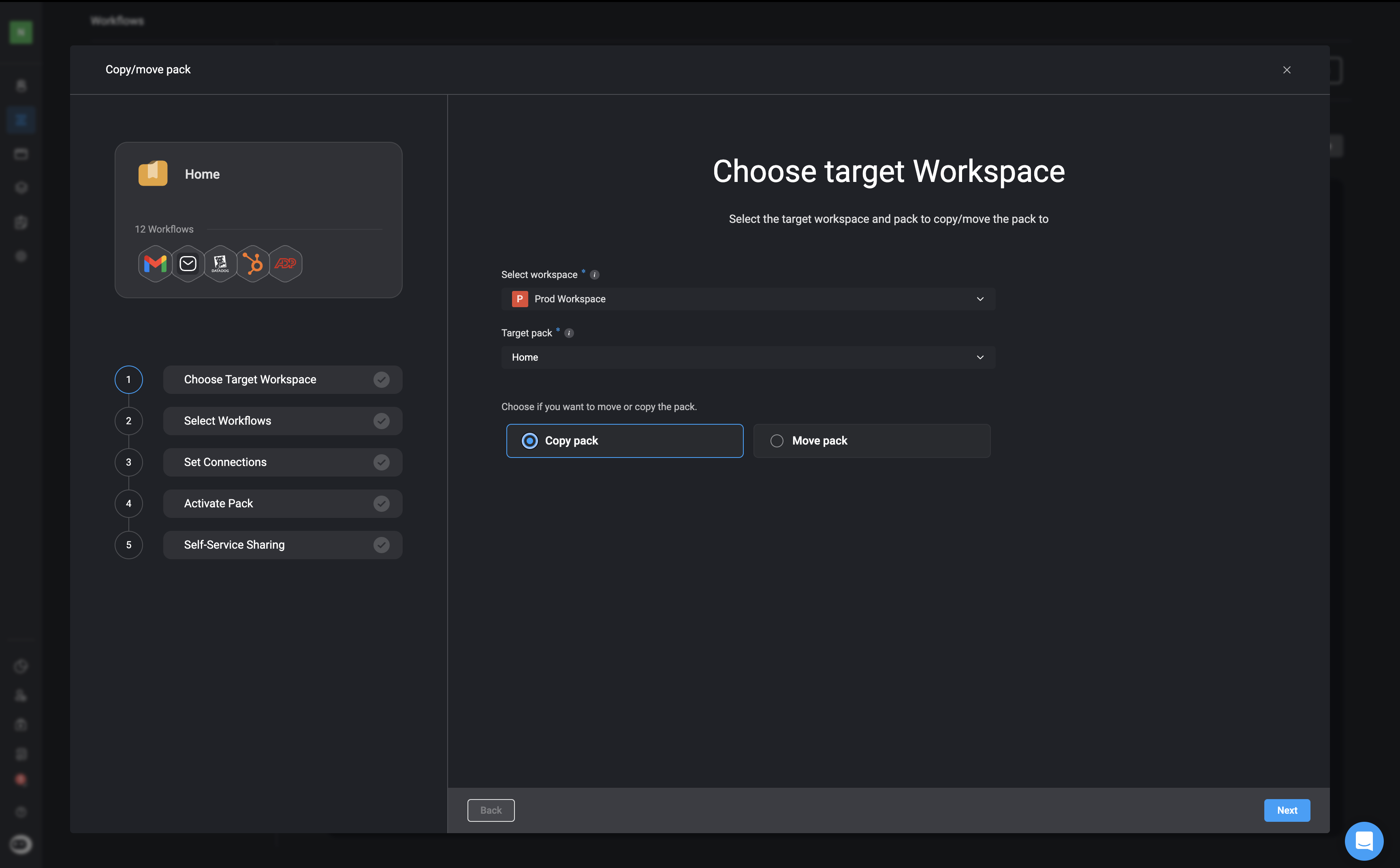 This will open the Copy/Move wizard, where you can select which workspace you want to Copy/Move the pack to. First select the workspace, then select the target pack, and choose whether you wish to Copy or Move the selected pack to the target workspace.