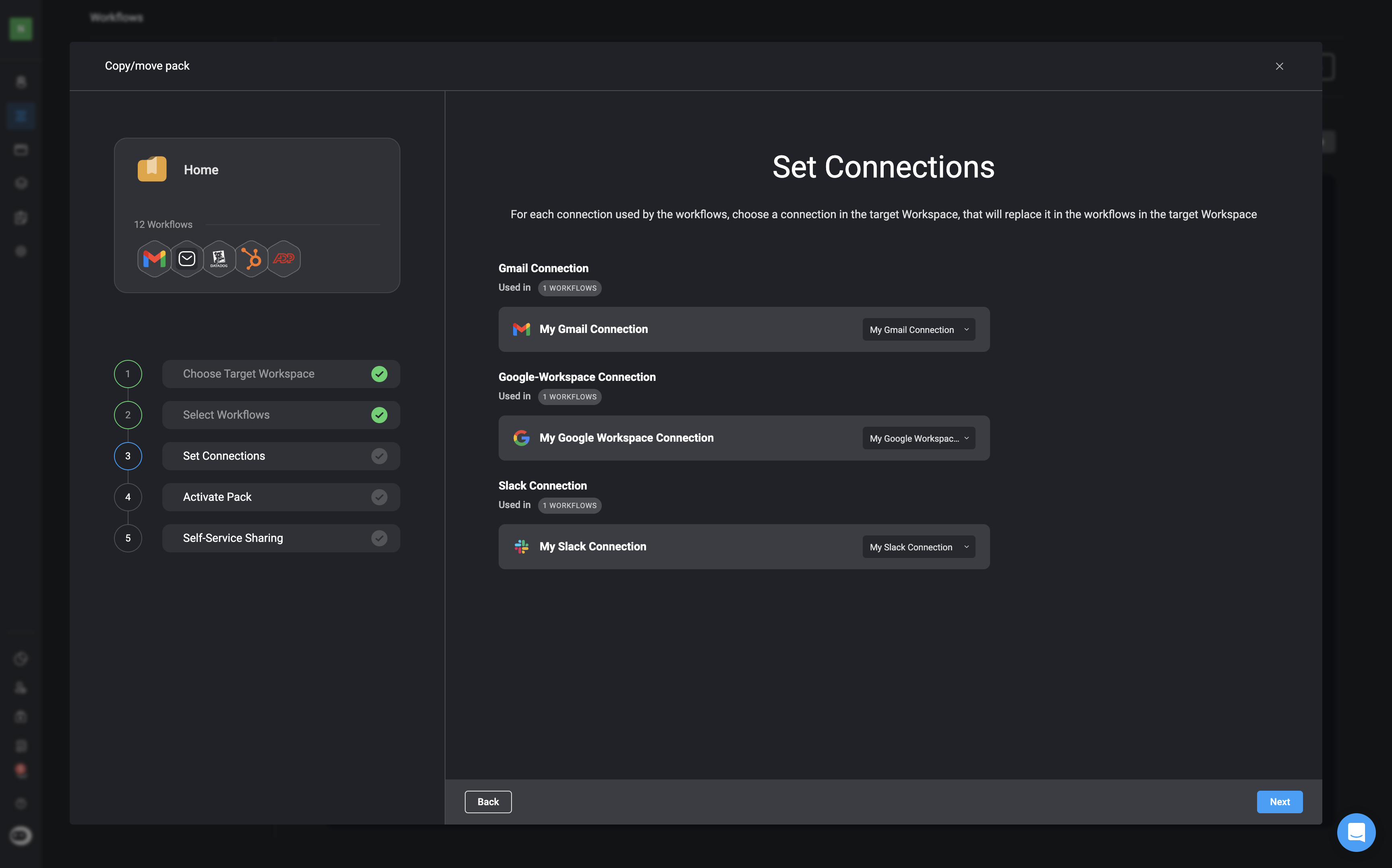 For each connection used by the selected workflows, set a connections in the target workplace, that will replace it in the copied/moved workflows.